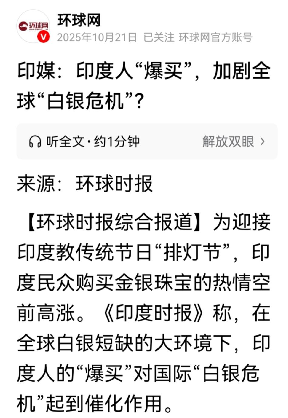 美国作梦都没想到印度抄了白银后路! 好一个黄雀在后,印度全世界抢购银子1000吨,美元可能气喘吁吁的,这是黄雀在后,被抄了后路。 中国对白银1月1日起战略管制,一单一审,是稀土后的又一个管制。 但有一个插曲,上海沪银库存近十年新低、10月出口超660吨驰援伦敦是事实,创单月历史峰值,大量白银流向伦敦以缓解当地供应紧张与高溢价问题。 赚钱和削弱美元那个是重点?不太明白。660吨是赚差价,不是英国主动调拔! 在1月1日管制前,660吨白银销往世界白银中心伦敦,时间卡的真准! 印度与俄罗斯等国尝试用白银/卢比/人民币结算能源贸易,降低双边交易对美元依赖,削弱美元在亚洲大宗商品结算的主导地位。 印度的这一刀,削弱美元对白银等商品的定价主导权,美国哑巴吃黄连,心里苦。 对美国,印度人的催化剂还是值得赞赏的。白银价格疯涨 黄金白银
