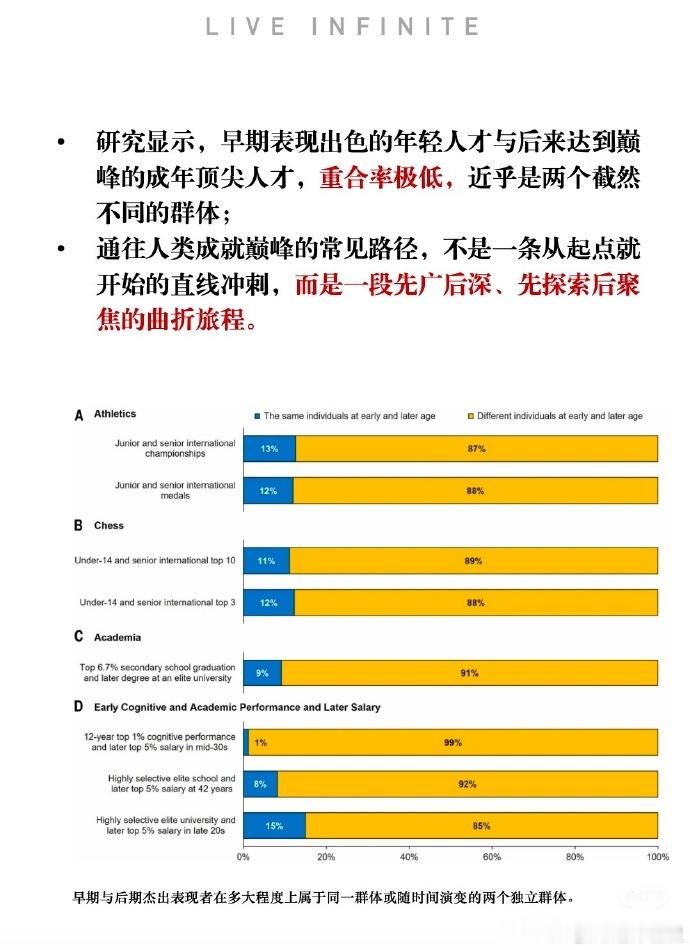 桂哥评:这个很简单,任何所谓的大的成就,可能都是需要长期积累,甚至一辈子的积累才能有所成就和突破。一个是看一个人的能力和天赋,一个还是要看长期的专注积累,认知的不断跃迁升级。人生的成就大都如此。不需要积累的所谓成就,人人都能做到,就不是成就了。只有少数人能够做到的成就,绝大多数人做不了的成就。那一定是有层层门槛,层层困难,挡在了前面。一次次突破这些门槛,都需要时间,经验,天赋,堆积。当然,有了人工智能帮忙,人类的突破层层门槛的能力,会不断的升级加速。为什么说,咱们需要认知不断升级跃迁,永不停息。学习能力是核心关键,就是如此。别说什么成就,能让咱们人生过的少点挫折,少点困难,少点无知错误,人生不断过的更好一点,就是咱们人生的最大成就。不仅仅是金钱,健康,还有爱和尊重。全网热点共创计划 ===Science: 人生最终辉煌往往属于大器晚成者这篇发表于 2025年12月18日 的 Science 论文(Recent discoveries on the acquisition of the highest levels of human performance),通过对数万名国际顶尖人才(如诺贝尔奖得主、奥运冠军、国际象棋大师等)的成长轨迹进行分析,得出了颠覆传统认知的结论:通往人类最高成就的路径,并非“赢在起跑线”的直线冲刺,而是一条“先广后深、慢热逆袭”的曲线。这项研究囊括19个数据集,包括科学、音乐、体育、国际象棋等多个领域的34,839名国际顶尖人才:科学界:诺贝尔奖得主、仅获提名但未获奖的科学家、顶尖国家级科学家。体育界:奥运冠军、世界锦标赛奖牌获得者、并未在此级别获奖的国家级精英运动员。棋艺界:世界排名前三的棋手、排名前十以外的顶尖棋手。艺术界:历史上最著名的古典音乐作曲家研究者还分析了过去针对青少年和次级精英的66项代表性研究结果,采用了前瞻性和回顾性相结合的方法,追踪青少年时期表现优异的“神童”在成年后的轨迹;以及回溯已站在世界巅峰的成年人在青少年时期的表现,并对两个样本进行对比。为什么“慢”反而能“赢”?研究者提出了三个核心机制假说,解释了“慢热”和“跨界”为何是通往巅峰的普适法则:早期广泛的探索(尝试不同运动、学科或艺术形式),增加了个人找到那个与自身天赋、激情完美契合的“本命”领域的概率1。只有找到了最佳匹配点,潜能才能最大化爆发。增强学习资本假说 (Enhanced-Learning-Capital Hypothesis)早期的多样化经历就像为大脑搭建了更复杂的“认知脚手架”迁移能力: 跨领域的经验培养了灵活的思维和解决问题的能力独特视角: 例如,诺贝尔奖得主常将其他领域的灵感引入科学,实现颠覆性创新 有限风险假说 (Limited-Risks Hypothesis)过早的孤注一掷和高强度专项训练(如“鸡娃”式教育或青训)伴随着高风险:生理风险: 过度使用导致的伤病、身体过早报废心理风险: 职业倦怠、兴趣丧失机会成本: 一旦该领域遇到瓶颈,人生缺乏备选项。 而早期的多元化发展相当于“分散投资”,保证了职业