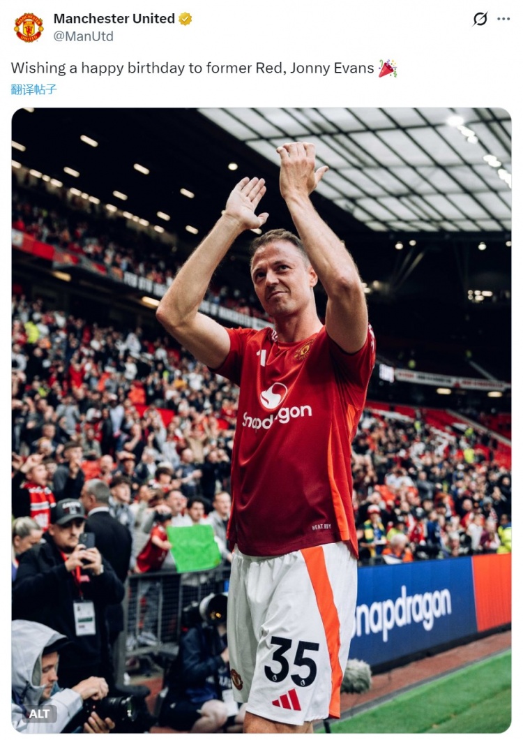 曼联官方社媒晒出埃文斯效力球队时期的照片,配文:“祝前红魔球员埃文斯生日快乐!”