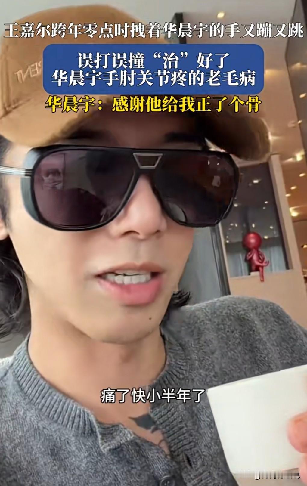 这真是让我见识到了什么叫做歪打正着啊。 华晨宇的手臂痛了有半年了。 各位,您猜怎么着? 就在1月1日跨年夜上,王嘉尔非常的兴奋和华晨宇打招呼握手,用力的拽了华晨宇的手臂。 结果第2天华晨宇的手臂竟然不痛了。 这可真是歪打正着啊,不得不服啊。 还给他正了骨了。 [憨笑]。 得好好感谢一下王嘉尔,得请他吃顿饭才行啊。
