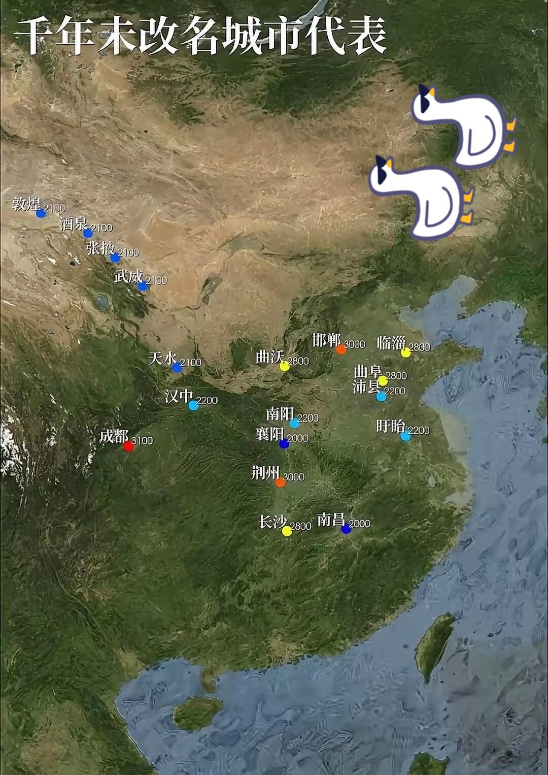 现在是2026年1月3日早上六点。 昨天看到一个朋友发的下面这张图,有点感慨。因为这上面写的几千年来没改过名字的地方,有好多个都是我自己去过的,而且其中有些并不是没改名,而是改了几遍改回来的。 去年带娃去甘肃,才知道酒泉、张掖、武威都曾换过名字,肃州、甘州、凉州的古称,藏着“葡萄美酒夜光杯”的豪迈。临淄成了淄博的一个区,荆州合并沙市又改回原名,襄阳和樊城从合称襄樊再归为襄阳,这些名字的变迁,都是活着的历史。 十几年前在襄阳坐过的铁皮轮渡,摇摇晃晃离江水才十几厘米,如今听说因水源保护已撤销,只剩回忆里的惊险与惬意。其实所谓“未改名”,不过是人们对历史的执念,那些改了又改的名字,恰恰见证了文明的延续。 旅行的意义从不是打卡地名,而是触摸名字背后的岁月沉淀。你去过哪些藏着故事的古地名?