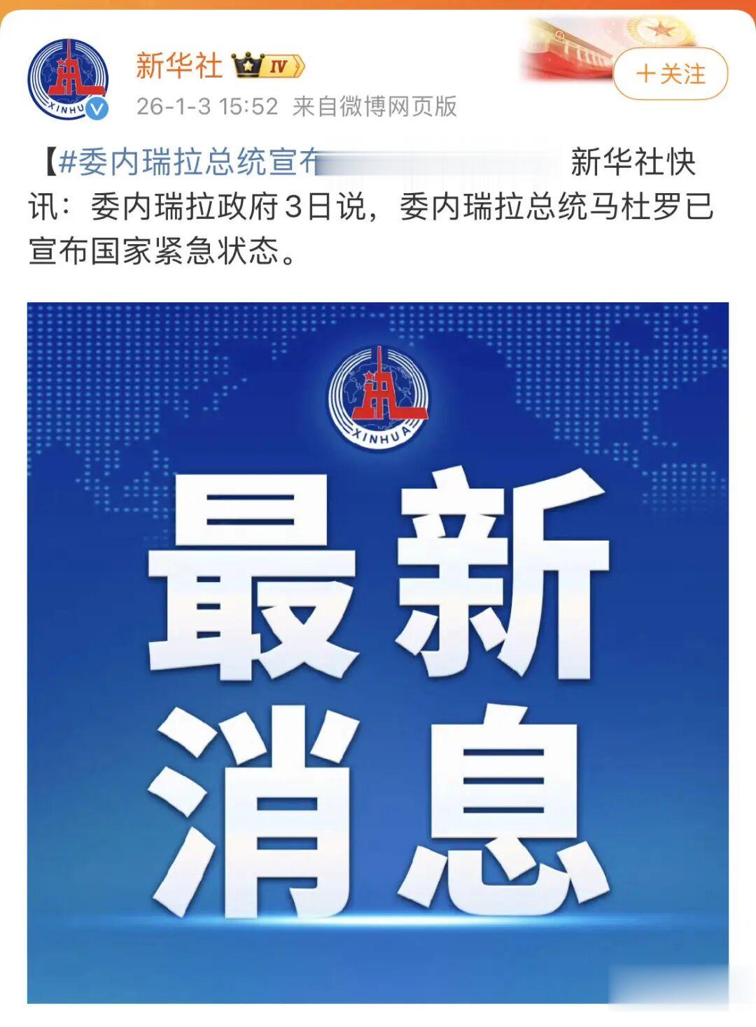 委内瑞拉政府3日说,委内瑞拉总统马杜罗已宣布国家紧急状态。