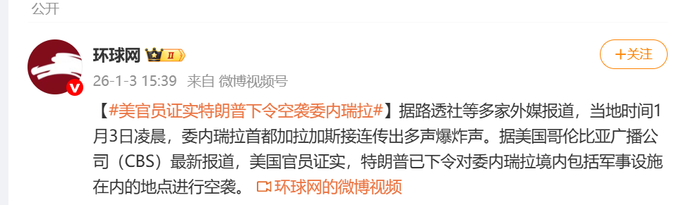 据@CCTV国际时讯消息,当地时间1月3日凌晨2点多,委内瑞拉首都加拉加斯多个地区接连传出爆炸声。目前爆炸原因不明,当地已响起防空警报。舆论普遍猜测,美军空袭委内瑞拉首都。据美国哥伦比亚广播公司(CBS)最新报道,美国官员证实,特朗普已下令对委内瑞拉境内包括军事设施在内的地点进行空袭。