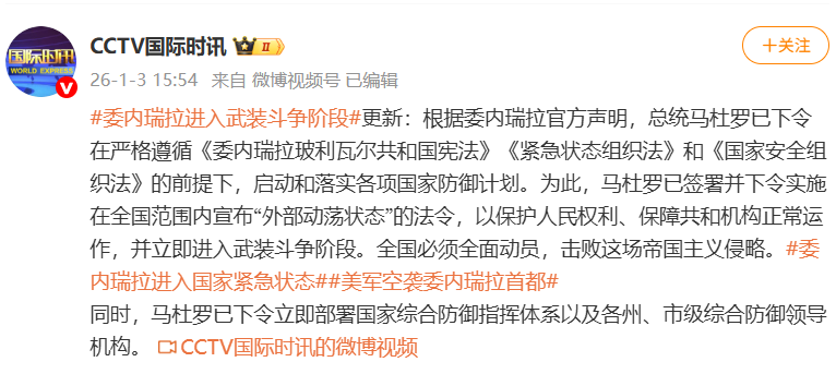委内瑞拉外交部发布公告,严正拒绝、强烈谴责并向国际社会揭露美国政府对委内瑞拉领土和人民实施的极其严重的军事侵略行径。该侵略针对委内瑞拉首都加拉加斯市的民用与军事区域,以及米兰达州、阿拉瓜州和拉瓜伊拉州。