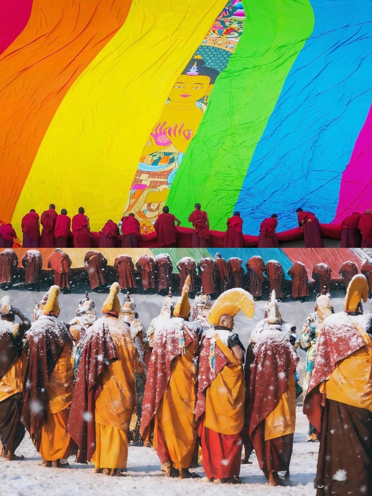 来一场甘南晒佛节的震撼, 真的要亲眼见才懂! 零下15℃的雪域山谷,天没亮就被法号声唤醒。红衣僧人簇拥着30丈巨幅唐卡,沿山麓攀登如长龙,绸缎展开的瞬间,阳光刚好落在佛额上,鎏金佛像熠熠生辉。 诵经声漫过经幡,藏民匍匐跪拜抛哈达,浑身冻得发抖也舍不得移开眼。这哪里是节日,分明是刻进骨子里的信仰共鸣! 提醒想去的朋友,保暖装备焊在身上,尊重当地禁忌,这场跨越千里的信仰之约,绝对能记一辈子!