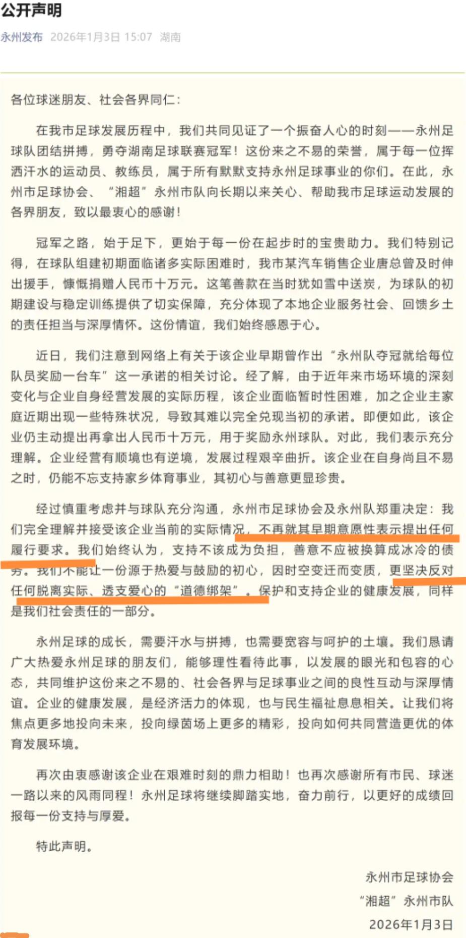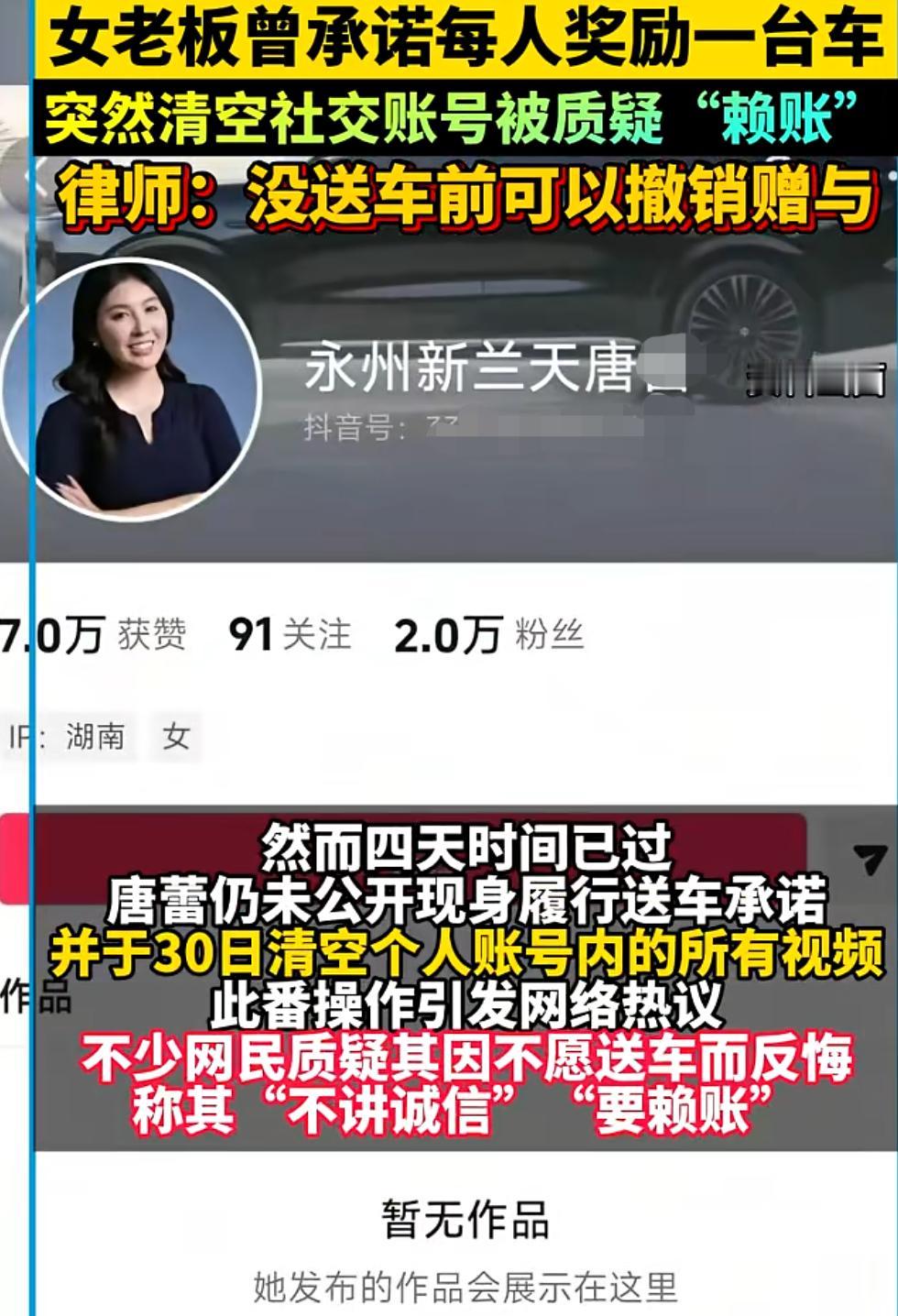 湘超永州女老板 承诺夺冠送车未兑现 闹了几天终于尘埃落定 今天永州队发了声明,清楚明白的说了,理解该企业面临的困难,不再要求女老板兑现当初的承诺。 其实这事也没什么大不了的,女老板可以向球员和广大球迷朋友道个歉,自己一时口快,但公司实力不允许。 没必要个人社媒作品全部删除,人也联系不上,毕竟当初在球队最艰难时刻,女老板义不容辞拿了十万块钱。 女老板其实根本没有想那么多,她只是看场上踢球的11个人,每个人一台车才多少钱,没想到后面还有教练领队等,加一起30多个人,全队送车金额太高,本身自己也不是什么大企业。 点到为止吧,雪中送炭往往比锦上添花更难能可贵,永州队也说了,不管送不送车,永州都要感谢她,赛前激励,为永州夺冠起到了助推作用。 真金白银出10万块钱,换不回10万的掌声,打个鸡血鼓励一下却让自己陷入舆论漩涡,以后再有想赞助的,真就要谨慎发言。 永州队这则声明已是最好的结果,有感谢,有体谅,有不道德绑架,当初女老板激励球队也是出于热心,现在各家企业都很难,互相理解共渡难关吧! 承诺夺冠送车的永州女老板仍未现身 湘超永州队