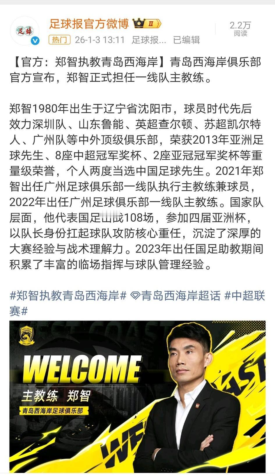 西海岸成为国足教练培训点?邵佳一升任国足主帅,郑智接替邵佳一担任西海岸主帅。 短短一年多,伊万当时身边的三位80后助教邵佳一、郑智、陈涛(现深圳鹏城主帅)都找到了主教练岗位。 从国足队长到中超主帅,从广州队保级功臣到国足助教,郑智的执教硬实力有目共睹。 他的教练组还有其他曾经的国足兄弟,黄博文是助理教练,李雷雷是守门员教练。