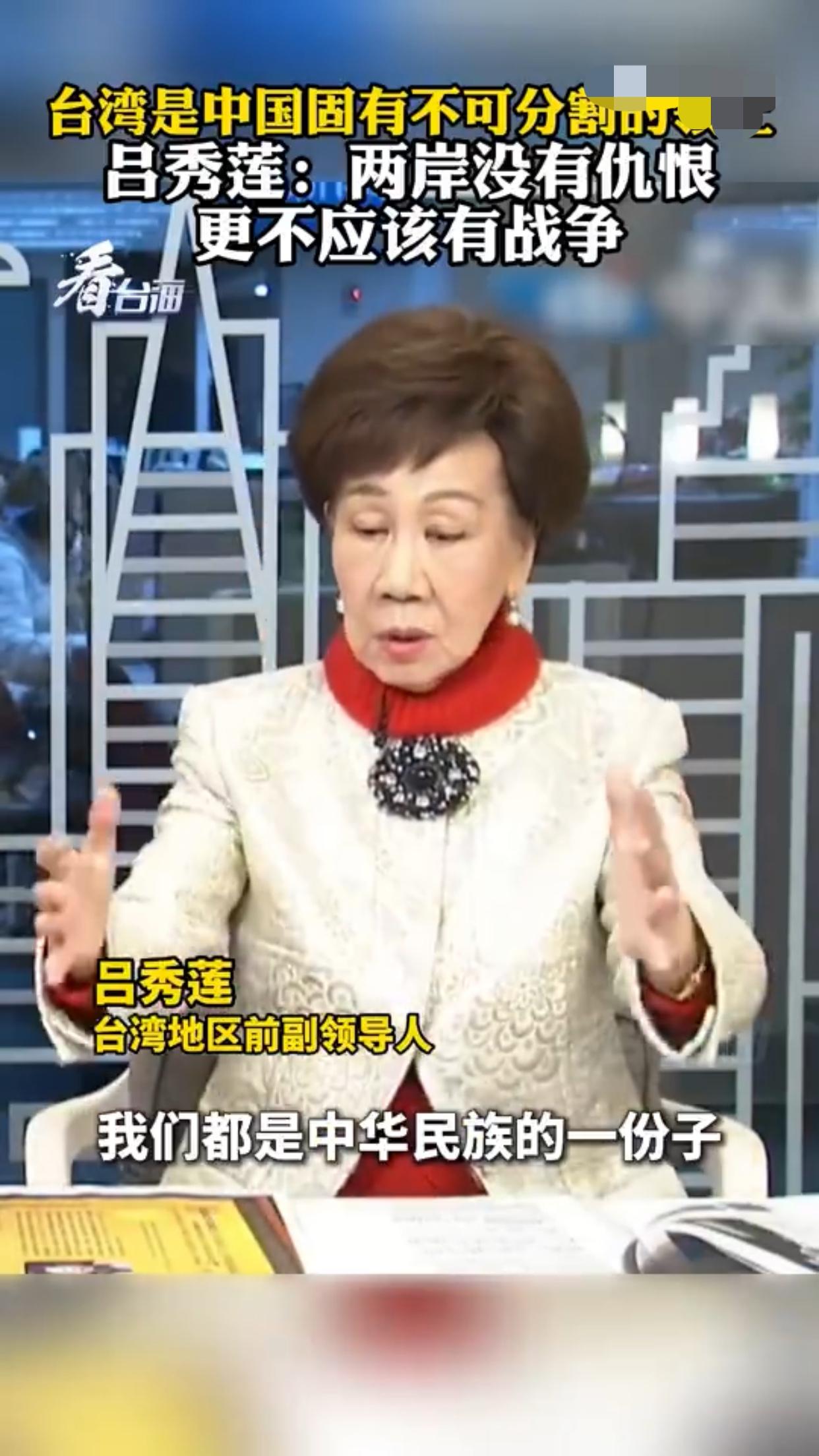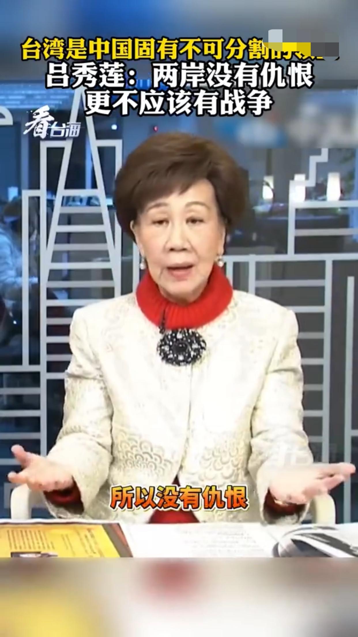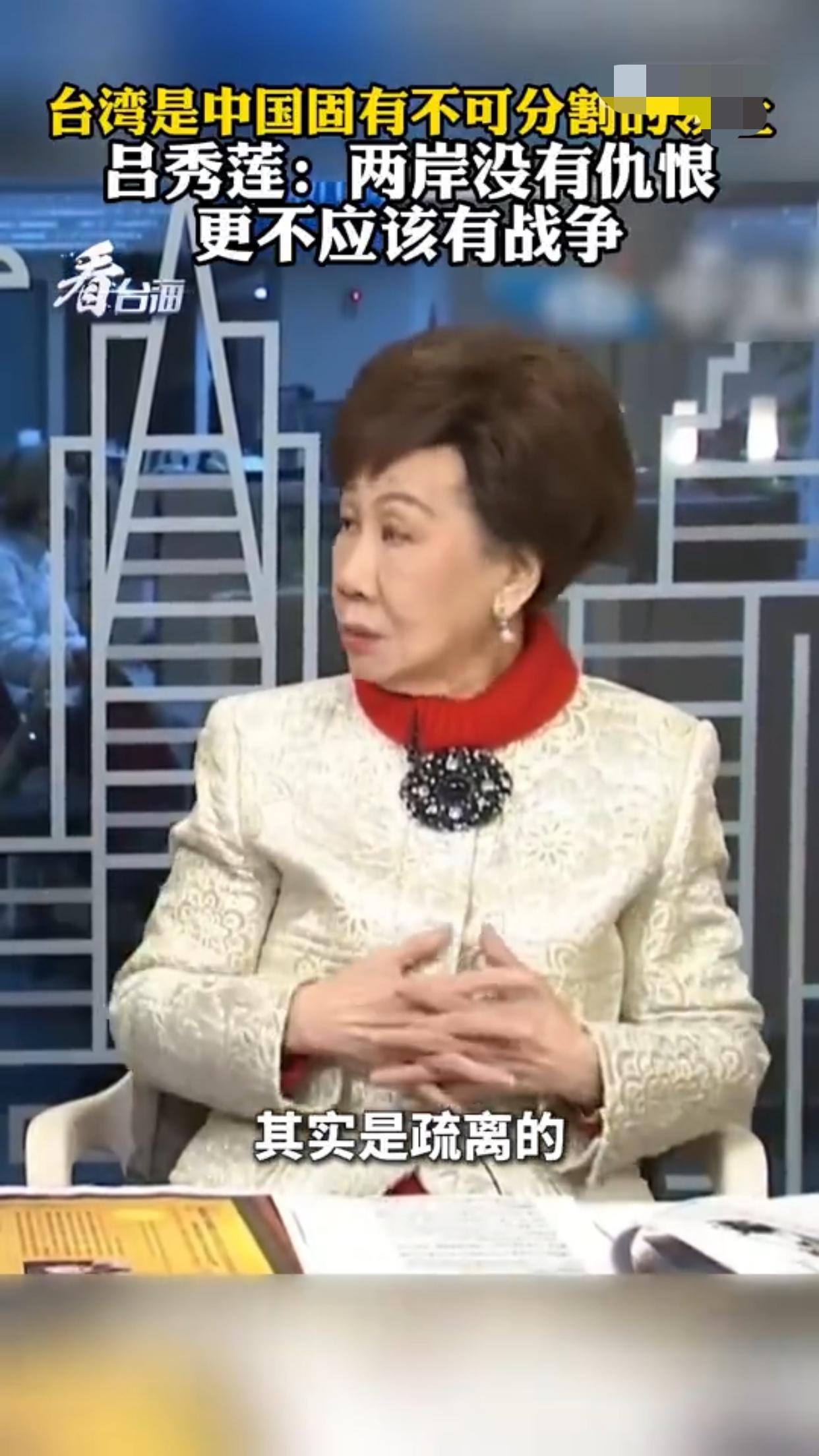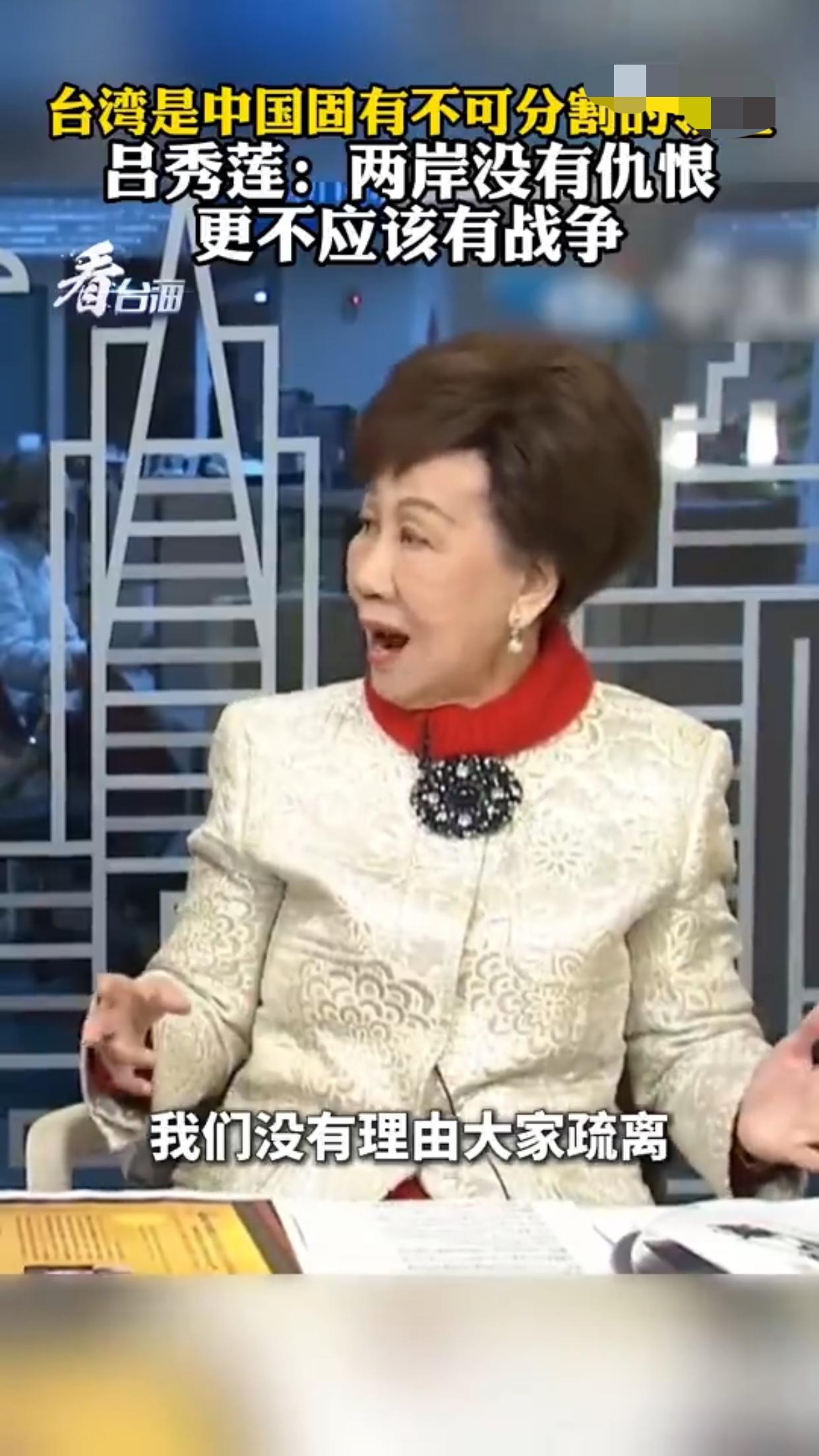 台湾吕秀莲表示:台湾是中国固有不可分割的领土,我们都是中华民族的一份子,任何人都不能否认,我们没有理由让大家疏离,但目前来讲是疏离的,我想了很久,大家都要和平,我们要减少仇恨,不能纵容“台独”分子,所以没有仇恨,更不应该有战争。
