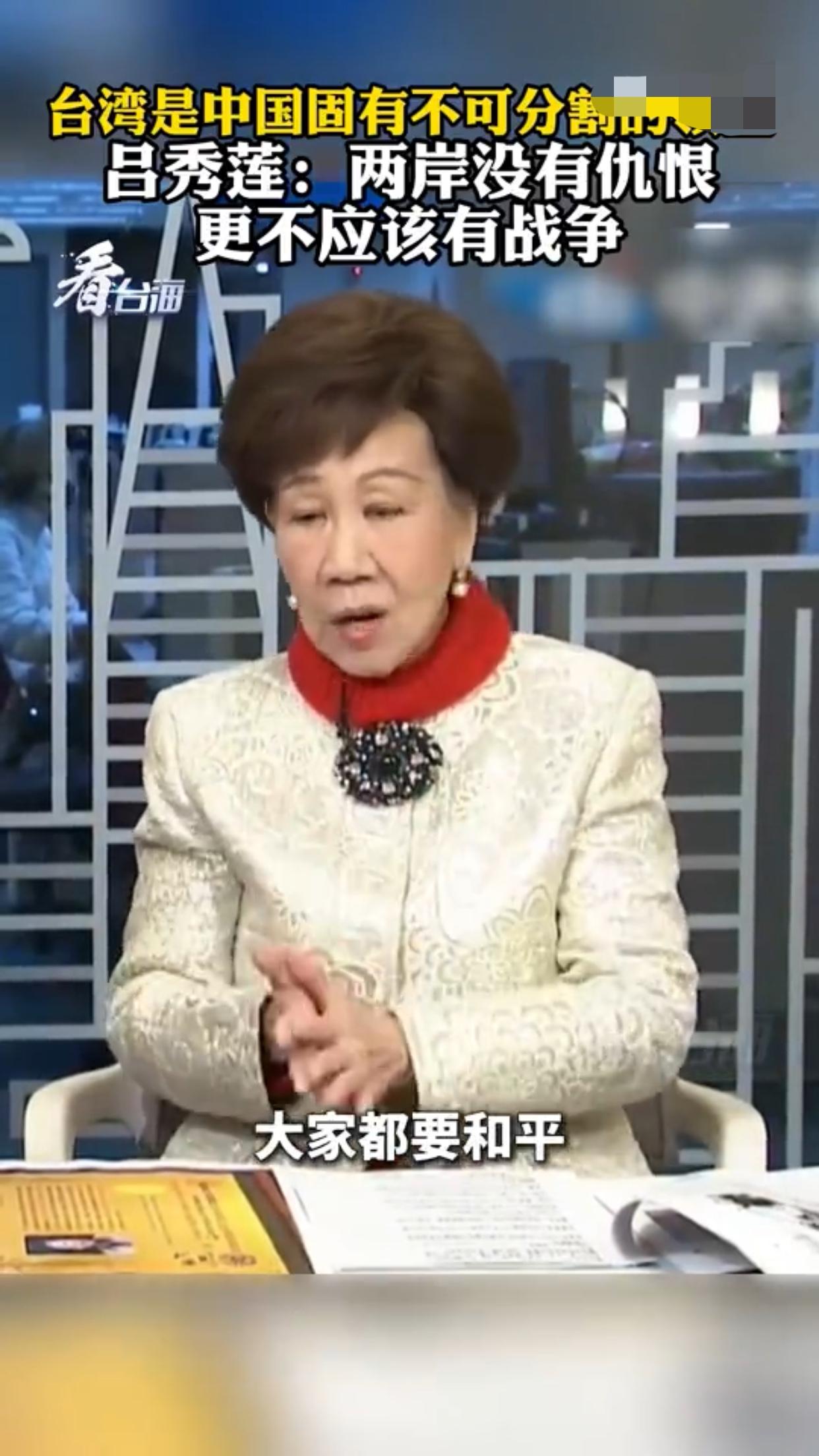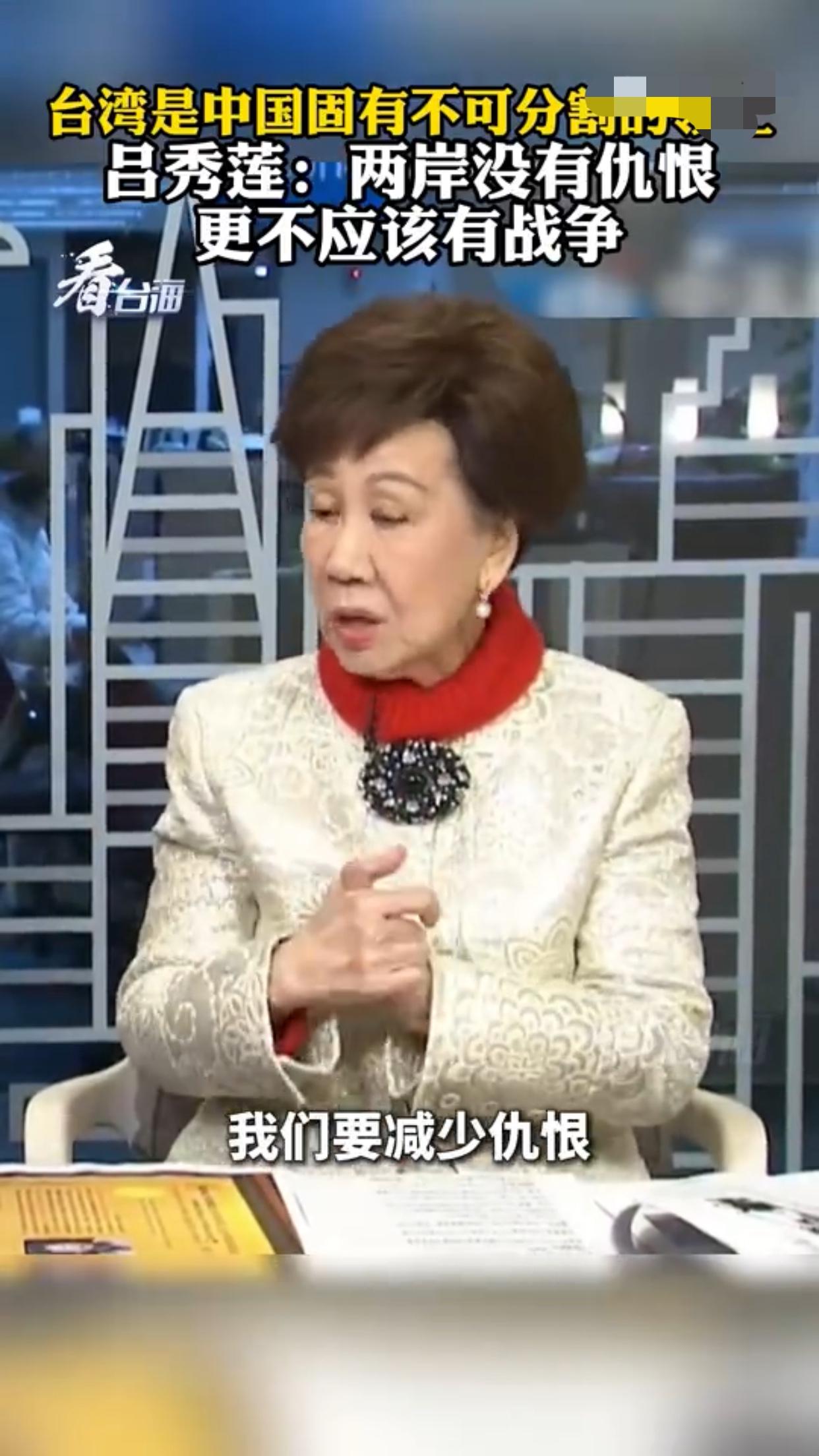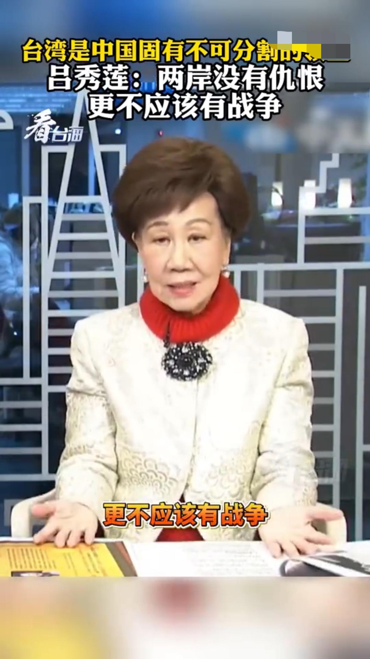 台湾吕秀莲表示:台湾是中国固有不可分割的领土,我们都是中华民族的一份子,任何人都不能否认,我们没有理由让大家疏离,但目前来讲是疏离的,我想了很久,大家都要和平,我们要减少仇恨,不能纵容“台独”分子,所以没有仇恨,更不应该有战争。