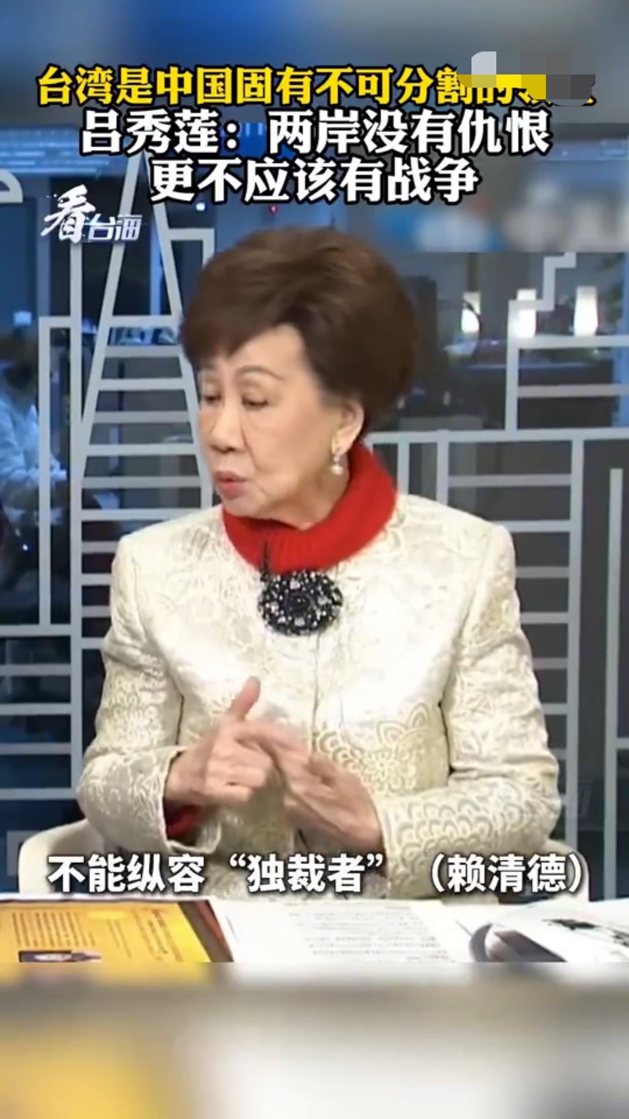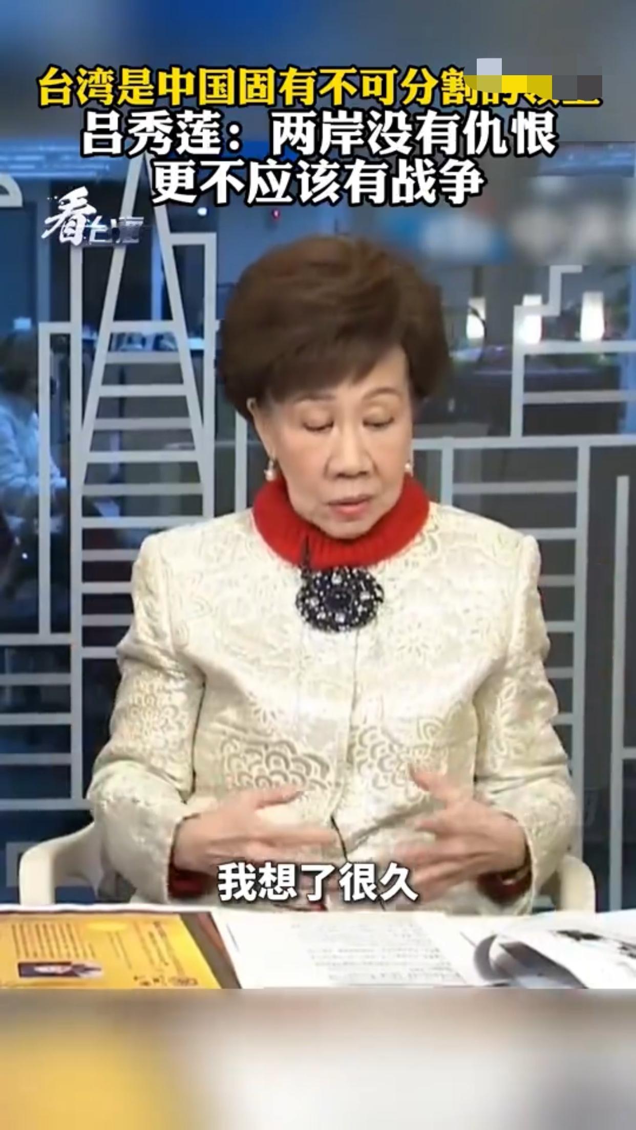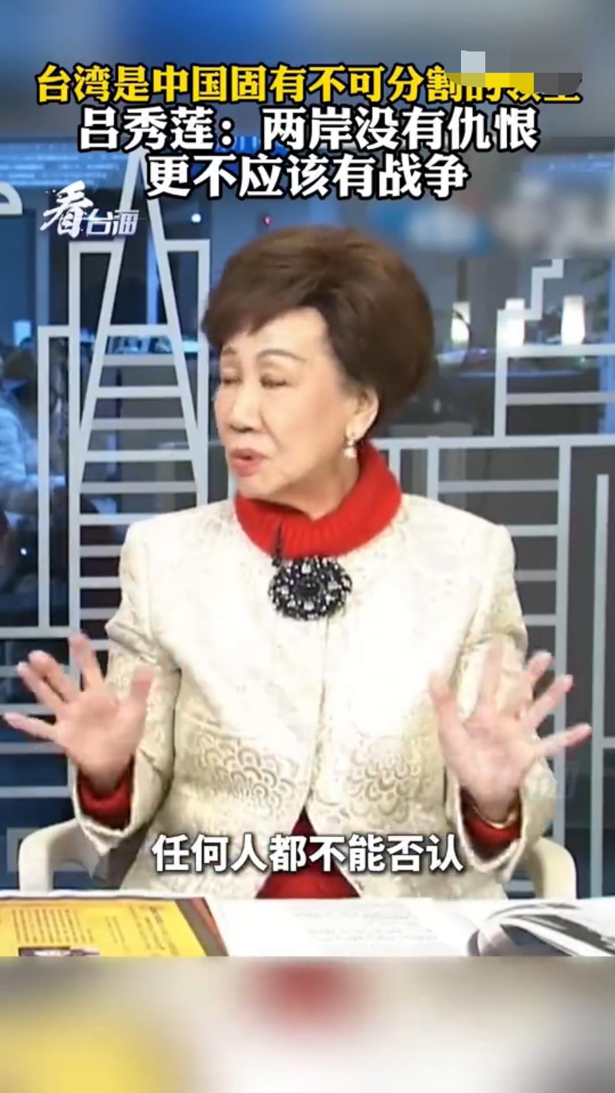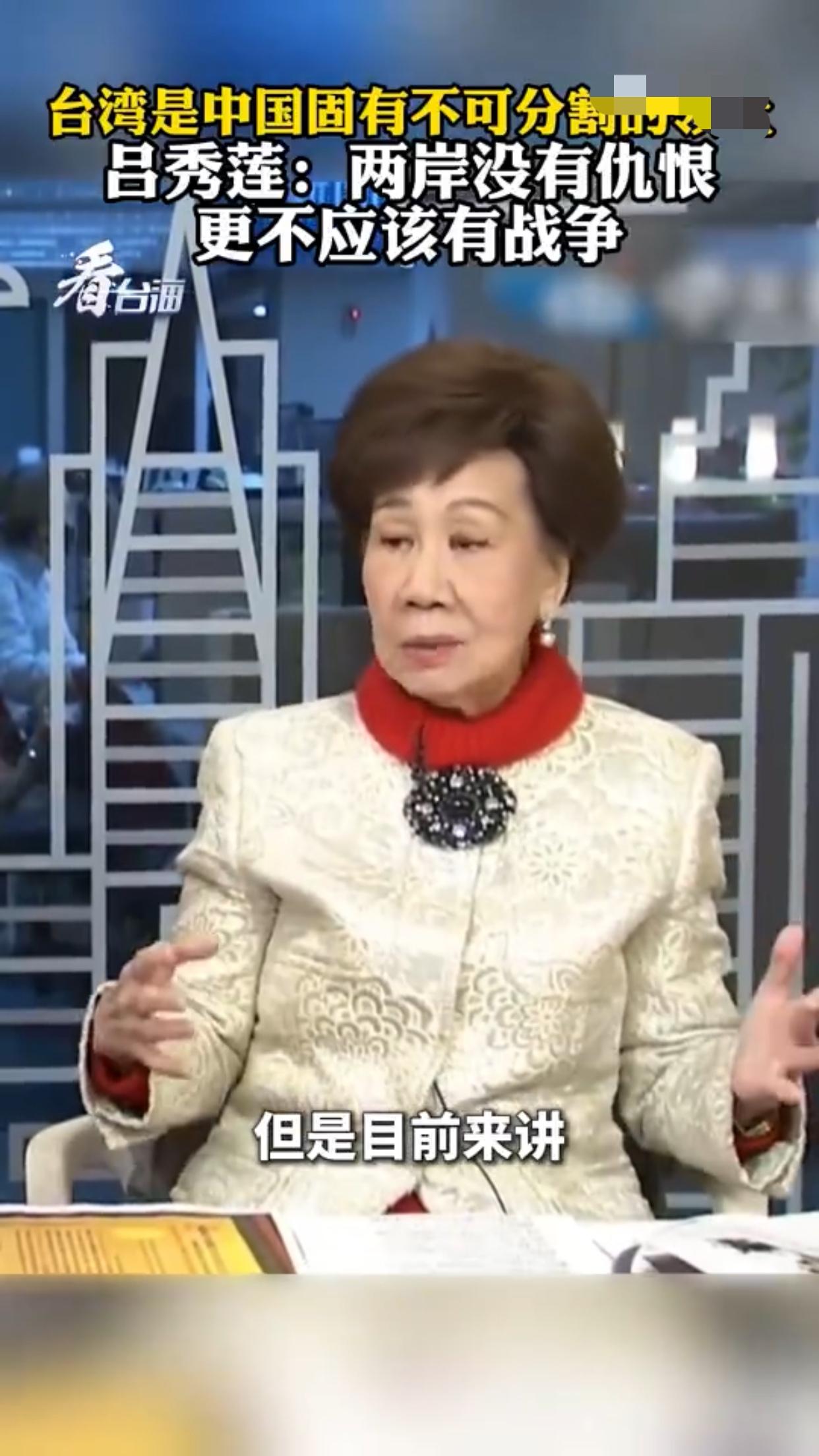 台湾吕秀莲表示:台湾是中国固有不可分割的领土,我们都是中华民族的一份子,任何人都不能否认,我们没有理由让大家疏离,但目前来讲是疏离的,我想了很久,大家都要和平,我们要减少仇恨,不能纵容“台独”分子,所以没有仇恨,更不应该有战争。
