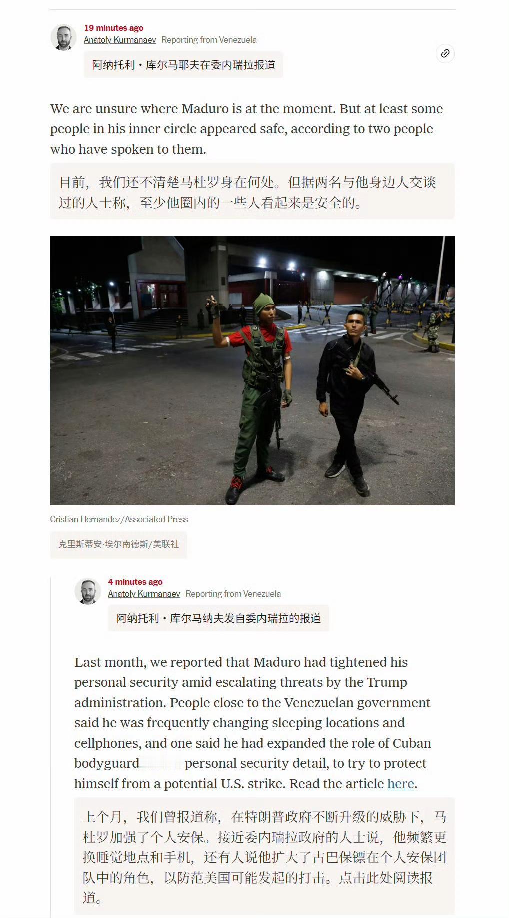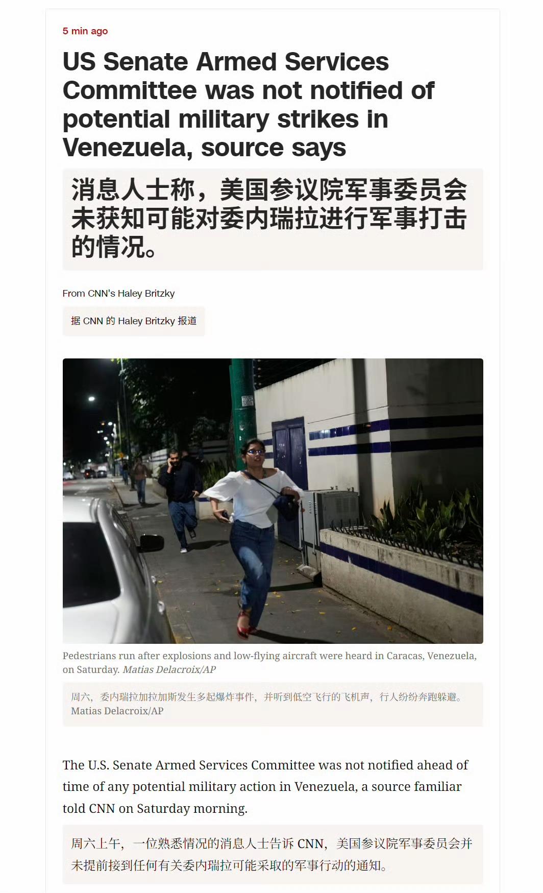 美军对委内瑞拉进行空袭。 搞笑的是,双方官方都没有正式回应这事。特别是没有回应战果,也没有什么图片、视频啥的,全是媒体在报道。 可能双方都觉得不理想。 空袭是1月3日开始的。美国参议院军事委员会表示未获知美国可能对委内瑞拉进行军事打击的情况。 俄罗斯RT记者猜测可能是美军发起的攻击,委内瑞拉首都加拉加斯和拉瓜伊拉都遭到了攻击。至当地时间凌晨三点,已停火半小时了,安静。 已停火半小时了,川普可以宣传大赢,委内瑞拉也可以宣传大赢,击退了美军。 民航客机绕行波多黎各(美国在加勒比海的属地),美军可能从那起飞轰炸的。 南美洲国家军队实力太弱了,基本上都没有打过什么仗的经历,最多和毒枭、黑邦打过,实力远不如非洲、中东国家。所以,委内瑞拉的实力连胡塞武装、黎巴嫩真主党部队、阿富汗塔利班都不如。 如果美国还是也拿不下,不敢地面进入,那就尴尬了!