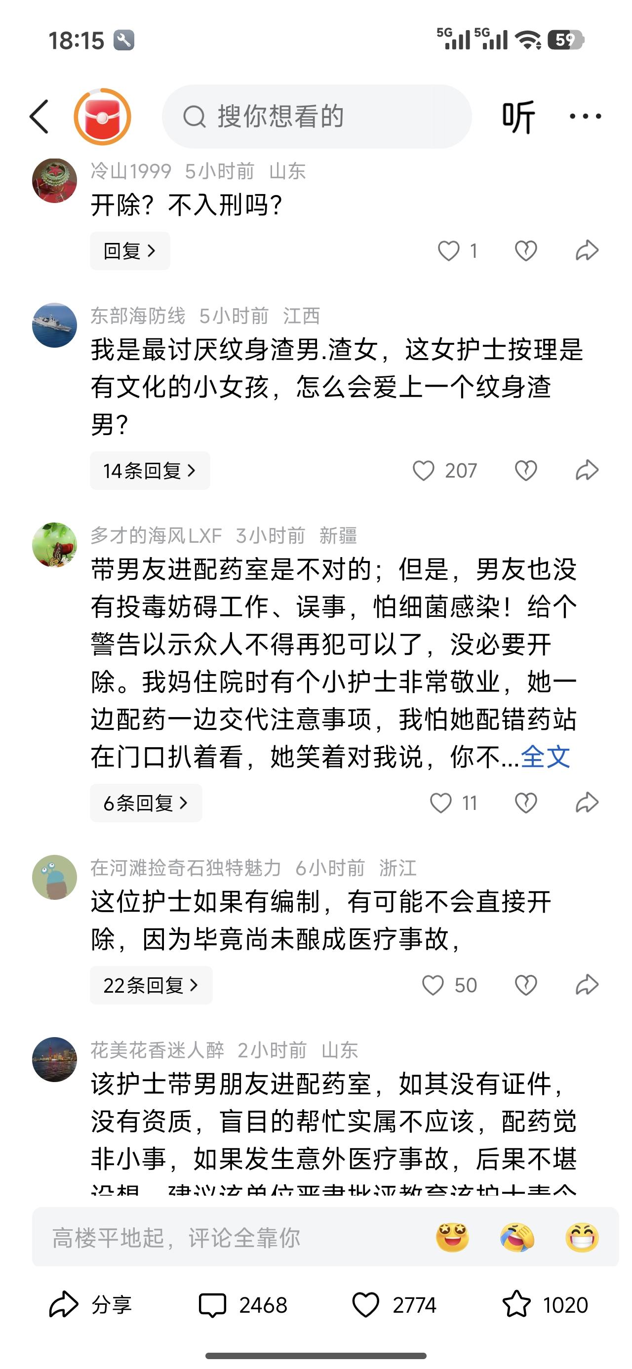 带花臂男友进护士站帮自己干活的护士已经被辞退了。 人命关天的事,就这么草率的决定了。她休息,他干活。他啥学历啊!他会吗?就这么水灵灵的干上了? 这又不是解放前,没有人才可用。俩人太大胆了,给患者配错药咋办?拿人家命不当命啊!这姑娘以后还能有资格干护士吗?不得吊销她资格吗?打螺丝去得了。这么不守规矩的人。
