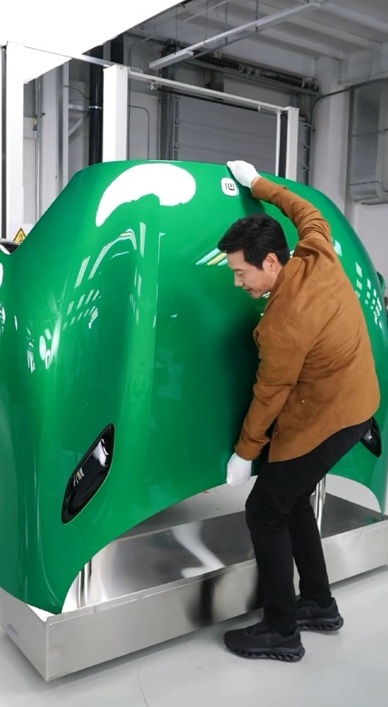 他解释称,首先是比例好看,另外还有很多实用价值,会更加安全。他还现场搬起拆下来的前机盖,他表示采用的材质是全铝,有助于实现整车的轻量化。
