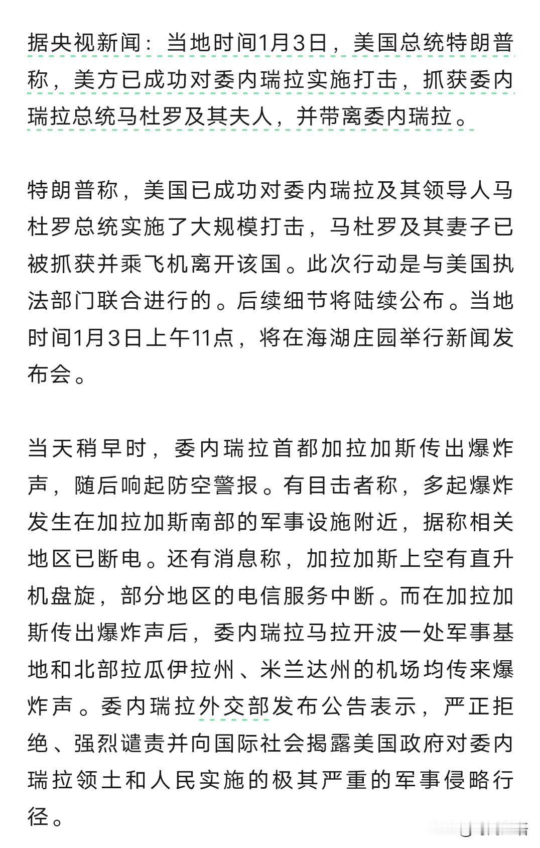 今天,震惊世界的一幕发生了,特朗普称美军已进入委内瑞拉,并完成了抓捕马杜罗及其夫人的任务。 如果特朗普说的是事实,这将是美国1989年入侵巴拿马抓捕总统诺列加的翻版。 当然1994年美国还入侵过海地,推翻了军政府扶持了阿里斯蒂德复职。 特朗普的话到底靠不靠谱目前还没有官方证实,但大概率这事是发生了,即便马杜罗夫妇没被美军抓捕,也是自己坐飞机撤离了委内瑞拉。 无论真假,美国这种公然入侵别国去抓捕其合法总统的行径都应受到谴责……
