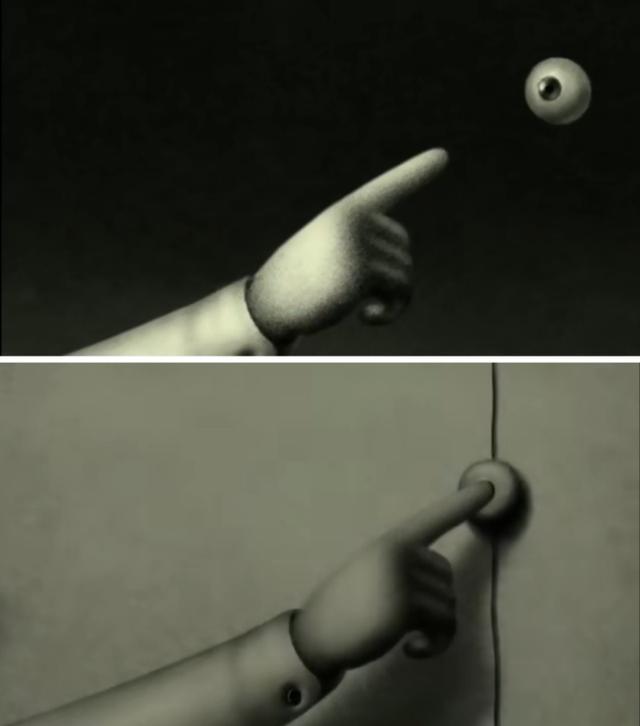 当然在这位导演2010年的《访客》中,也有黑眼圈。到那个短片更明确地把方向引导到了心理学,内心惶恐、不安,同样熟悉的鹅山,危险的幻象,在山中的盘桓,以及那危险的指向眼熟的手指最后幻化为一把钥匙和一把门锁。如果我们把一部动画短片当作一个心理测试,那么导演就是暂时的心理医生,而在幽微的人心中,并没有一个心理医生可以拍着胸脯告诉你:我可以带你走出去!因为实际上,这是一个咨询者和一个心理医生,共同在一座山里寻找出路。