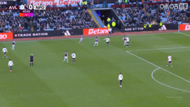 伤停补时1分钟。上半场比赛结束,阿斯顿维拉1-0诺丁汉森林。
