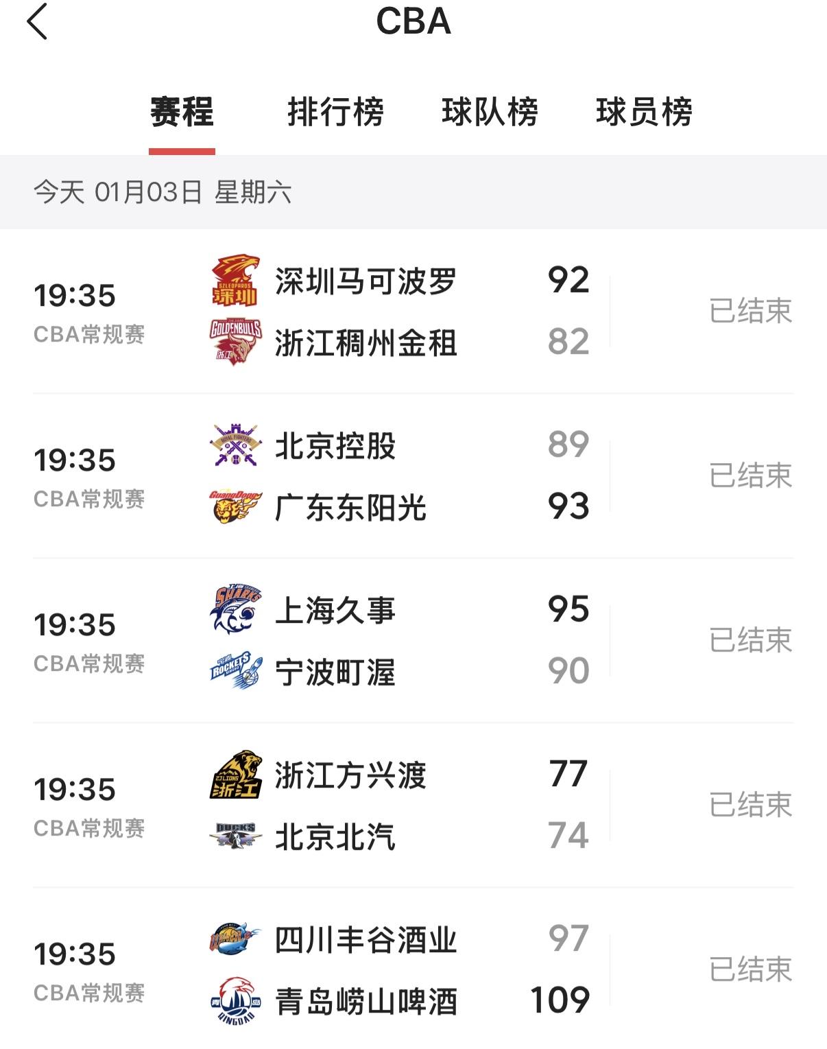 CBA常规赛今天进行了5场比赛! 看点不多! 1、缺少了布朗的浙江广厦男篮仍然战胜北京北汽男篮,双杀对手的同时豪取八连胜,实力确实强大!北京北汽关键时刻还是掉链子! 2、广东男篮客场艰难战胜北京北控,差点被逆转!缺少了徐杰,广东男篮的实力确实受到很大影响! 3、宁波男篮本赛季是一匹黑马啊!客场小负强大的上海久事男篮,值得期待. 4、上一场靠争议赢球的浙江稠州男篮本轮惨败深圳男篮,赛场上还是靠实力说话的! 5、拥有了外援的四川男篮仍然难求一胜!本轮不出意外的输给了青岛男篮!已经10连败了,什么时候迎来首胜呢!