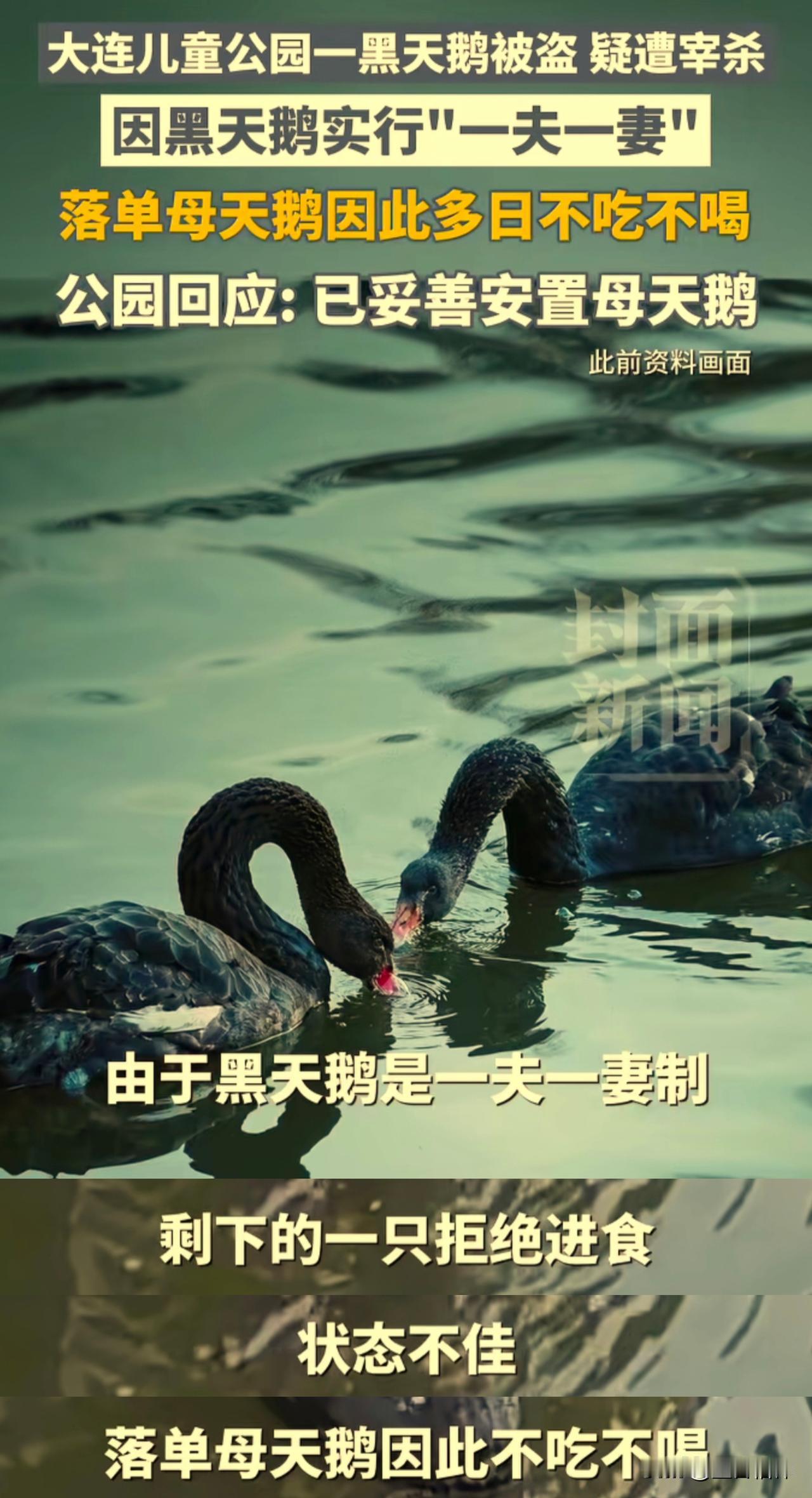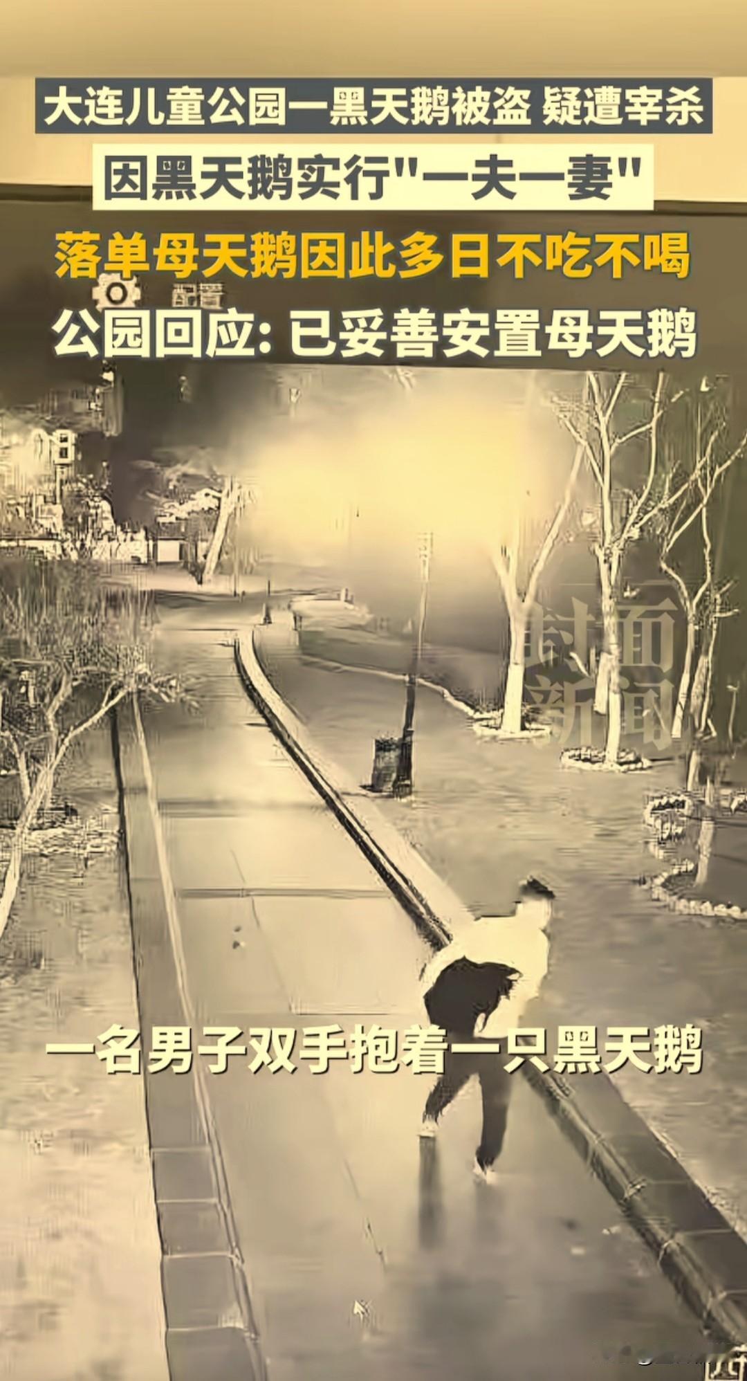 辽宁大连儿童公园内一只深受市民喜爱的黑天鹅,在元旦前夜被一名男子偷走,已被宰杀食用,幸存的雌天鹅因失去伴侣拒绝进食,状态不佳,目前已被安全转移。 这两只名字叫做“达达”和“优优”黑天鹅,是由一对来自昆明的夫妇投放,当时只有5个多月大,它们入住公园后,深得很多市民喜爱,很多人前来观看拍照打卡,已成了公园的“园宠”。 冬天到了,很多市民也常来看望并关心它们如何过冬,2025年12月15日,为帮助它们过冬,公园给它们搭建了新窝。 没想到12月31日这天凌晨,公天鹅“达达”被偷了,监控拍到一名男子怀抱黑天鹅走出公园,网友说该名男子已被抓获,但是天鹅已被这名男子宰杀吃了。 这对黑天鹅非常恩爱,它们严格遵守“一夫一妻”制,“优优”在失去丈夫“达达”后,表现出明显的悲伤情绪,一度孤独的在水面上徘徊并拒绝进食。 目前,“优优”在鸟语林接受专业照料,这起事件也引发市民的广泛关注和痛心,对偷盗和伤害动物的行为感到愤怒。 黑天鹅实拍 黑天鹅 黑天鹅照片 黑天鹅天鹅天鹅 黑天鹅观赏鹅