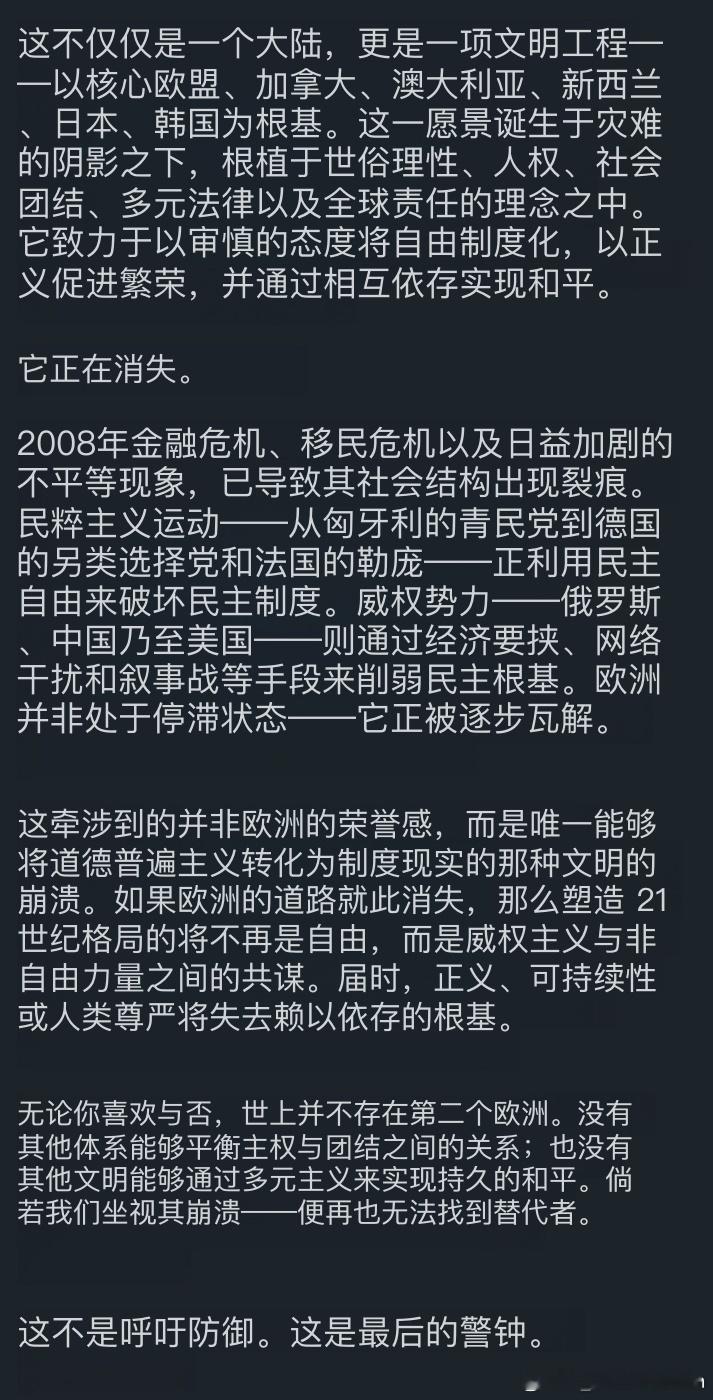 刷到一个欧洲小丑,我觉得他的臆想很能代表如今很大一部分欧洲所谓“精英”的思想。觉得欧洲是世界中心,希望日韩澳加新都围着欧洲转;贬低中国,觉得自己是世界上的文明救世主。真的。照照镜子看看自己现在什么样子了。还做着种族歧视高高在上的春梦呢。