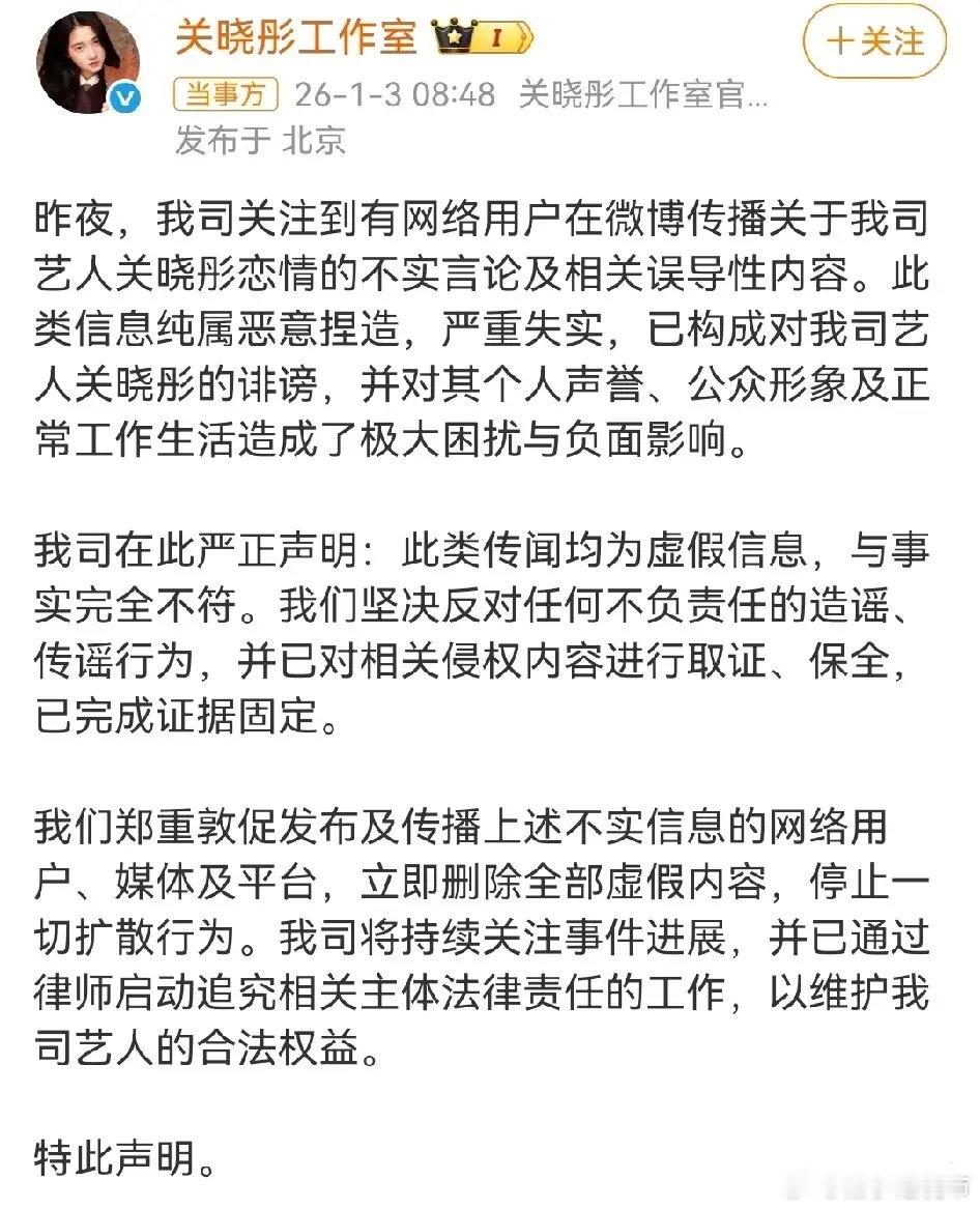 关晓彤太倒霉了!网红司晓迪爆料鹿晗和自己睡过后,又爆料关晓彤现在和王安宇在谈恋爱,把昔日顶流情侣以另外一种方式一同送上了热搜。鹿晗的反应很快,早上五六点就出来辟谣了,而且是连续两条辟谣声明,鹿晗也是被司晓迪爆料后,出来辟谣最早的一个,不得不说鹿晗的工作团队对舆情的监控和工作效率还是非常高的,今天还是元旦假期,就已经投入工作中了。其他明星的辟谣速度稍慢了一点,但也能理解,毕竟大晚上的爆料,真的让人无法预料。关晓彤的辟谣最晚,因为关晓彤估计也没想到,司晓迪爆料男明星还会扯上自己,且还是说自己和王安宇谈恋爱了,本来之前网上就传她是因为和王安宇谈恋爱了,才和鹿晗分手了,这要是被坐实了,她的口碑会受到很大的影响。所以关晓彤工作室不仅发了辟谣声明,还把这件事交给了律师,要起诉造谣者。感觉关晓彤是这场风波里最倒霉的一个,因为司晓迪的一句话就被扣上了和王安宇谈恋爱的帽子,真的是无妄之灾了。
