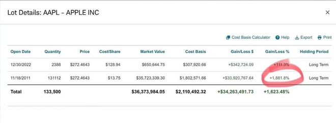 段永平称,“这是我管的一个账号上的苹果(股票),这么多年几乎没怎么动过。”图片显示,该账号分别于2011年11月和2022年12月买入苹果股票,第一次购入13.1万股,平均价13.75美元/股;第二次购入2388股,平均价128.94美元/股。两次投资分别为段永平带来3392万美元、34.27万美元的收益,收益率高达1881.8%、111.3%。