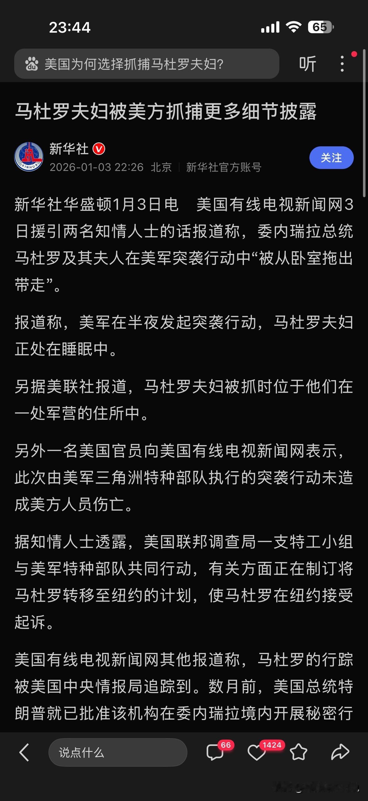 马杜罗夫妇居然是在军营住所里被美军抓走的,而且美军还无一人伤亡!这说明什么?我觉得说整个委内瑞拉军方都被美国渗透成了筛子都保守了,就算是筛子也总有那么一部份能起到作用吧。你想啊,人家美军直升飞机都飞到首都了,居然没人发现、没人预警。然后在军营里面总统被抓走了居然没能留下美军一兵一卒,要说不是系统性的被渗透,我倒立吃两包辣条!当然,也不排除美军吹牛皮夸大战果埋汰委内瑞拉的可能性!冬日生活打卡季