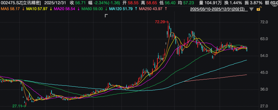 股价方面,节前最后一个交易日,立讯精密股价收跌2.34%,报56.71元/股,总市值4132亿元。2025年全年,公司股价累计上涨近40%,最高一度至72.2元/股,刷新历史纪录。