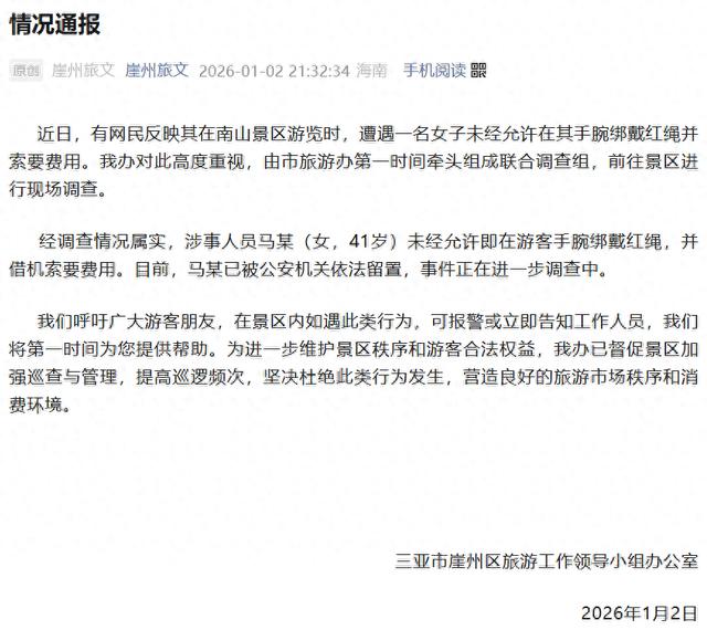 经调查情况属实,涉事人员马某(女,41岁)未经允许即在游客手腕绑戴红绳,并借机索要费用。目前,马某已被公安机关依法留置,事件正在进一步调查中。