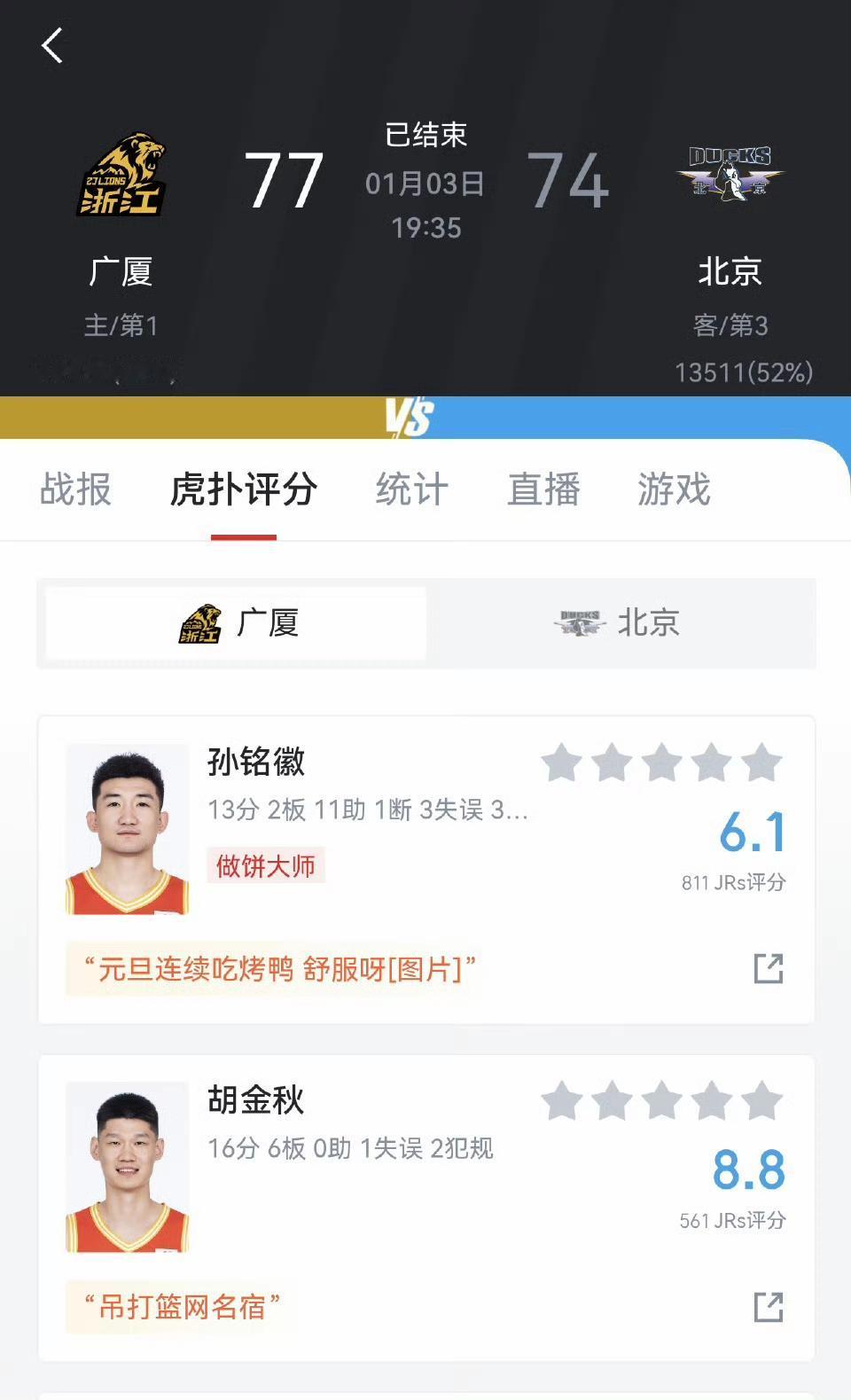 目前只有辽宁队本赛季击败过广厦队。CBA常规赛第10轮,广厦队77-74北汽,元旦期间广厦双杀北汽。 周琦空砍豪华两双,15分19篮板的统治级表现难救主,北京末节虽追平比分,却挡不住广厦的决胜韧性。 大前天北汽85-91不敌广厦,昨晚北京男篮再次惜败对手,赛季两场失利皆拜对手所赐。