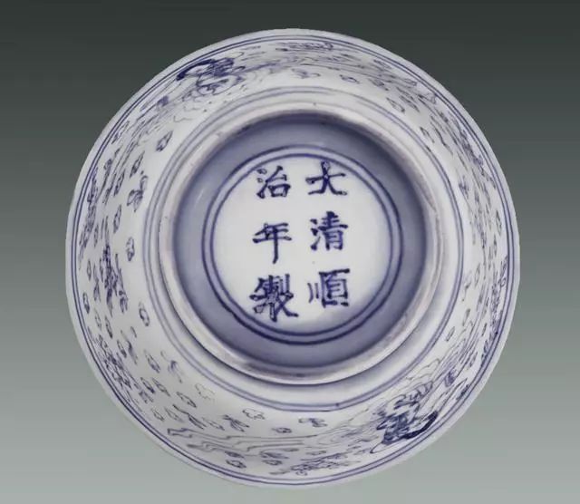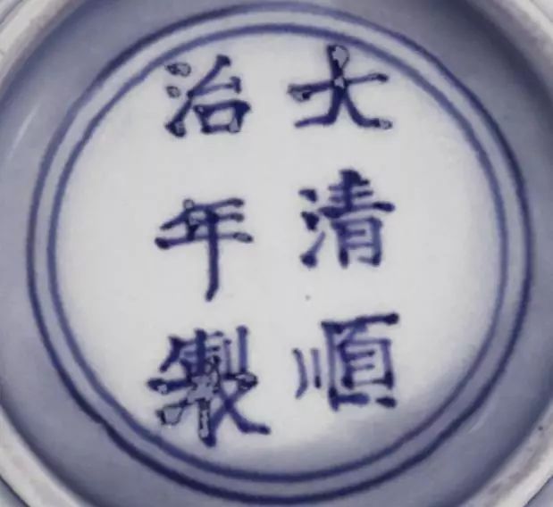 顺治官窑器以书写“大清顺治年制”两行六字楷书青花款为主,也有写“顺治年制”四字款。款字用笔有力、起笔见峰、住笔见顿、划多下拉、勾捺上剔,但整体布局不甚规整。