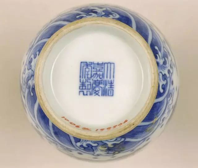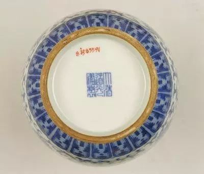 款识放大图8.清宣宗旻宁 - 道光 【1820 - 1850年 30年】道光官窑器一般以“大清道光年制”六字三行篆书青花款为主,也有抹红款及描金款。茶叶末、炉均釉等器物上则为六字刻款。个别粉彩器上偶见“道光年制”四字红地描金篆书款。道光时期落有堂名款的如“退思堂制”、“山解竹主人造”等,大多是精品。慎德堂是道光皇帝读书的地方,后期也成为道光皇帝处理政务的地方,故题有“慎德堂制”红款的道光朝瓷器应是道光皇帝的御用瓷。民窑款器亦多有六字或四字纪年款,一般均不太规整,开始出现百结图记款。
