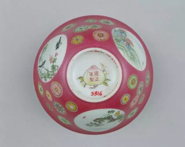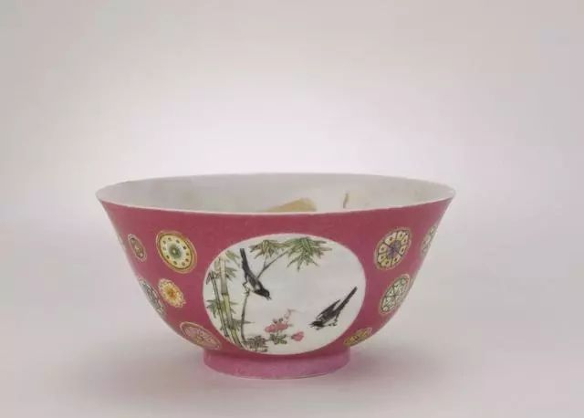 清雍正胭脂红地开光珐琅彩花鸟纹碗