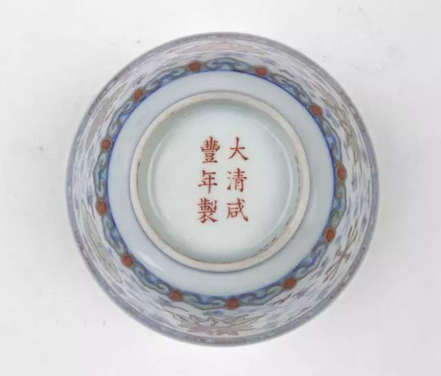 咸丰及其后的同治、光绪、宣统各朝再次兴起楷书题款风气,大多为六字双行或六字三行“大清××年制”款。款外均无圈框,字体工整,清秀修长,有青花、红彩、金彩、墨彩及刻款等形式。这一时期篆书款不多。其中光绪时署有“大雅斋”、“天地一家春”及“长春同庆”、“永庆长春”等款的官窑器最为精致。民窑款则多无定制,形式较多,同治时多有“同治年制”四字篆书戳记印款及抹红款。光绪时多伪托款,一般是“康熙年制”或“若深珍藏”。9.清文宗奕詝 - 咸丰 【1850 - 1861年 11年】