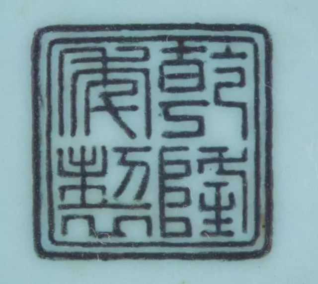 款识放大图7.清仁宗颙琰 - 嘉庆 【1796 - 1820年 25年】嘉庆官窑器一般都用“大清嘉庆年制”三行六字篆书款,主要为青花、无栏框。亦有少量楷书款。粉彩器上常见抹红款。个别器物用刻划款。民窑器中有六字篆字方款,亦有“嘉庆年制”四字款,大多十分草率,有的仅写半边字,还省减笔划,称为草记款,故十分难认。堂名款以“行有恒堂”、“嘉荫堂制”、“植本堂”等为多见。花押款除部分沿用乾隆时期的之外,新出现蝙蝠、桃子等款识。