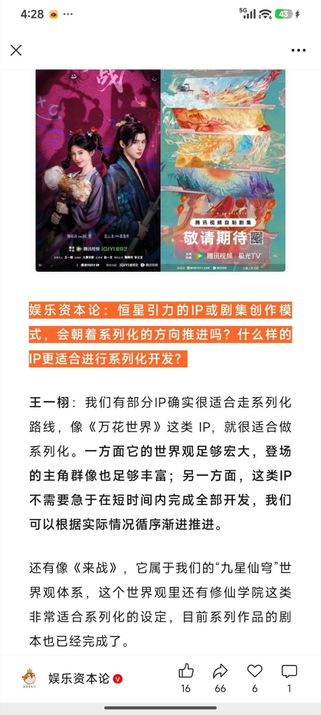 王一栩接受娱乐资本论采访,着重提了虞书欣主演的《永夜星河》和鞠婧祎主演的《来战》《万花世界》。
