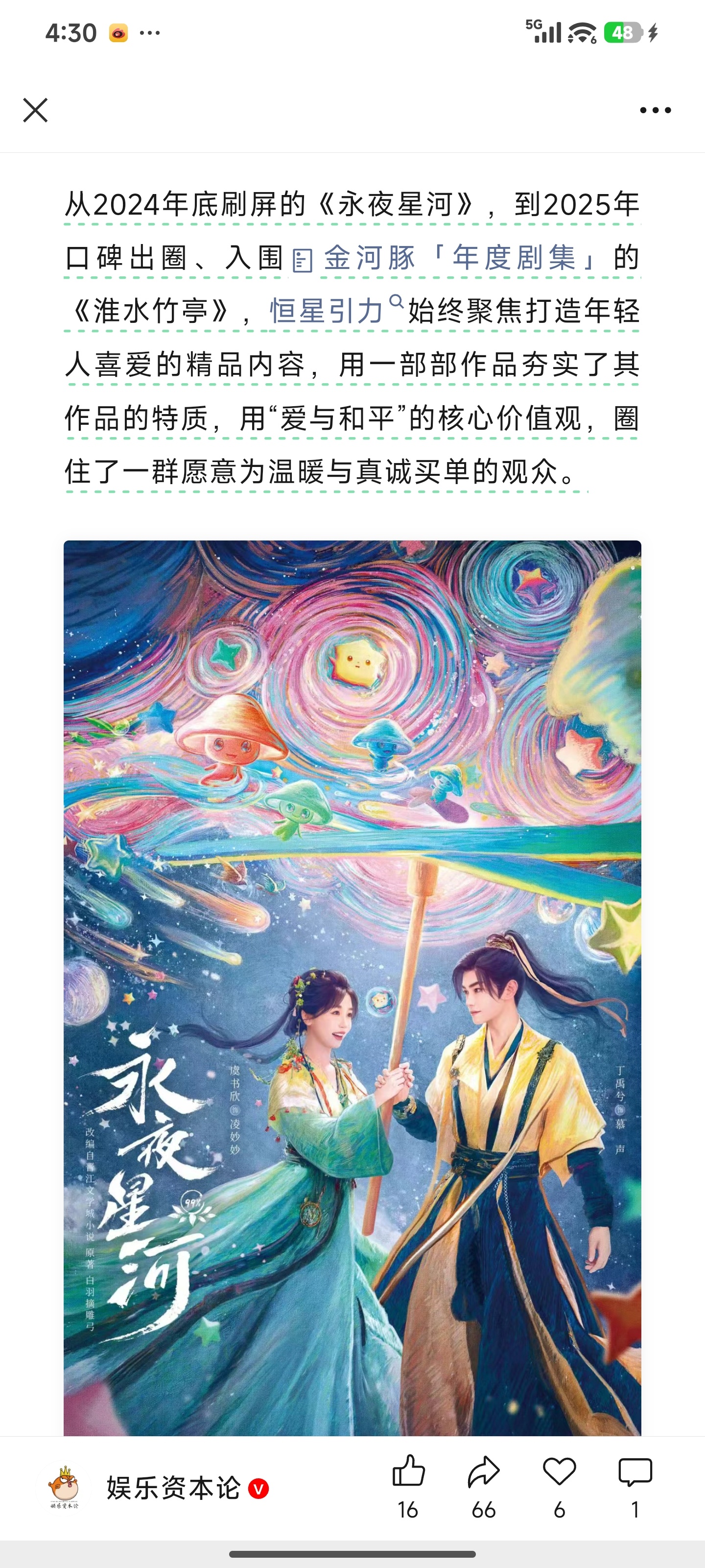 王一栩接受娱乐资本论采访,着重提了虞书欣主演的《永夜星河》和鞠婧祎主演的《来战》