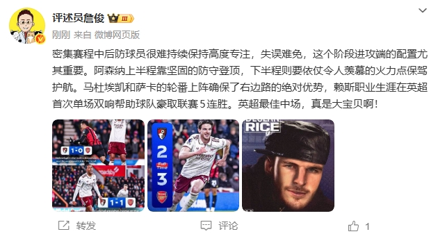 直播吧01月04日讯阿森纳本轮3-2击败伯恩茅斯,取得联赛5连胜,赛后,评述员詹俊发文。
