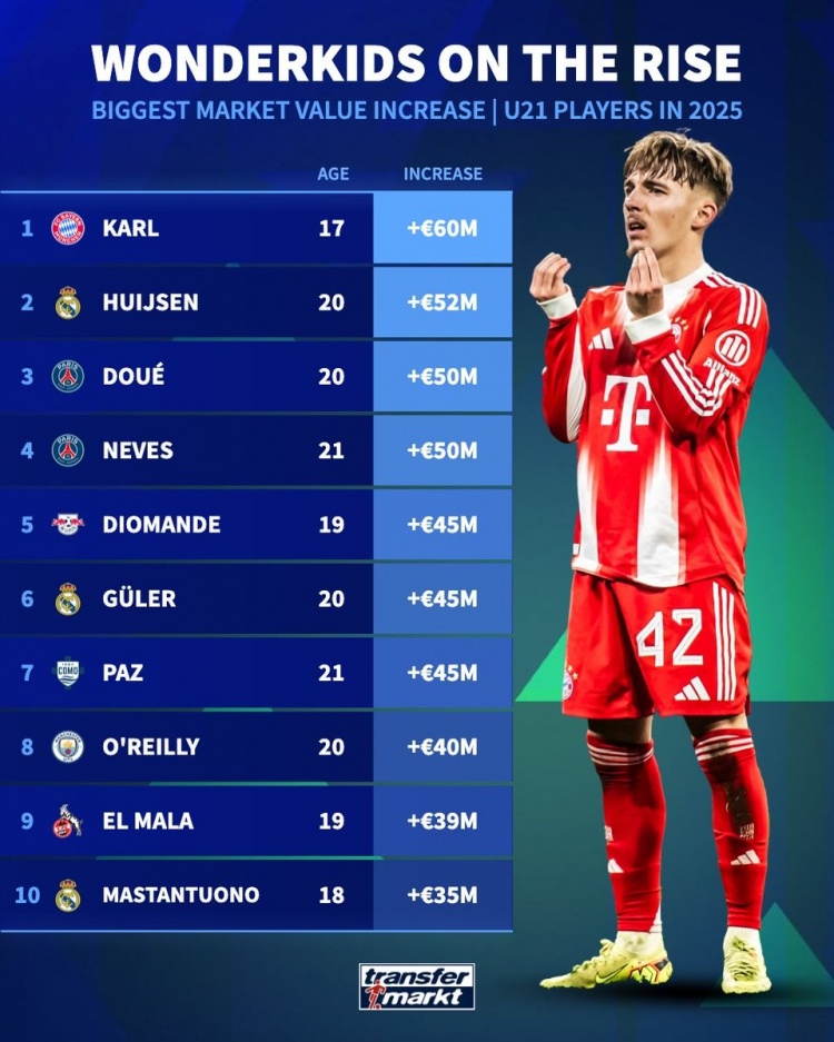 直播吧1月4日讯《转会市场》统计了2025年U21球员的身价上涨幅度情况,拜仁小将卡尔位居榜首。