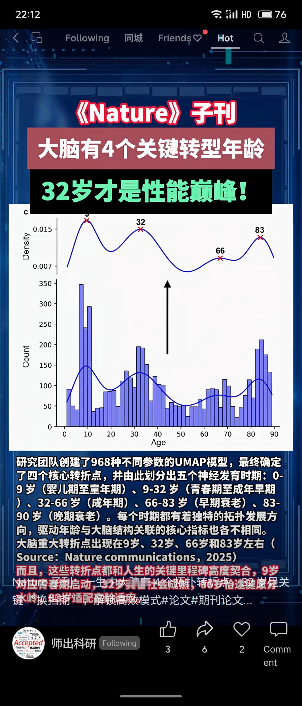 剑桥大学团队在《自然·通讯》发表研究,揭示人脑神经连接拓扑结构并非线性发展,而是会在9岁、32岁、66岁及83岁经历四次关键转折。这四大转折点将人生划分为五个神经发育阶段,每阶段都有独特的网络优化目标。研究特别指出,32岁左右是大脑综合性能的巅峰期,其神经网络的效率与整合度达到最佳状态,这与个人的社会成熟期高度契合。这一发现革新了人们对大脑终身发展模式的理解。