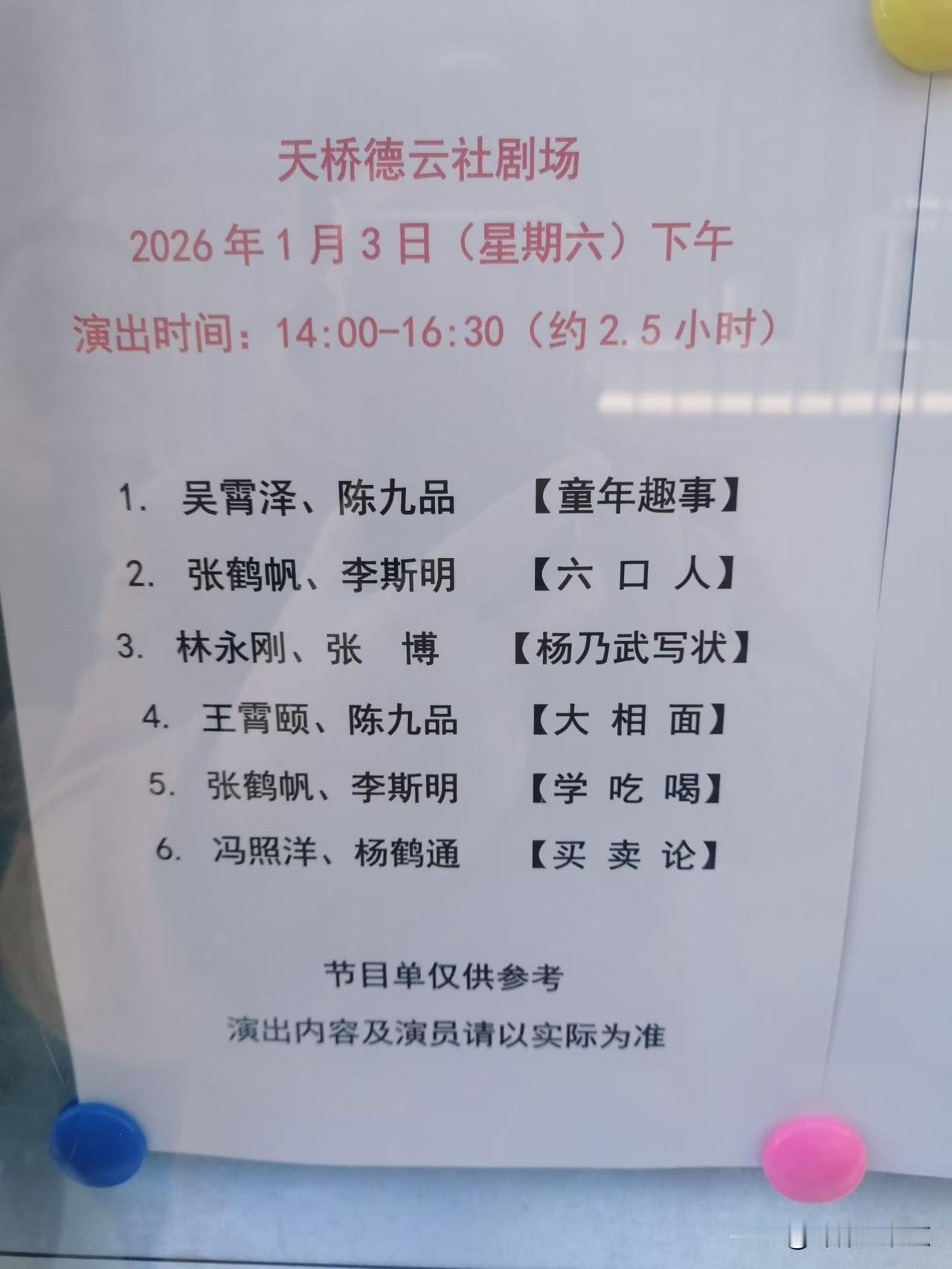 老郭,我到了天桥德云社啦! 2026/元/3,闲来无事,溜达到了北京天桥,来到了德云社。外边有几个人询问演出的事,保安说我也不清楚,晚上才演出。新鲜,当然是晚上演出! 从说相声的演员名单看,都不熟悉,我估计都是郭德纲的徒孙辈儿。 没在现场听过看过老郭老于和他徒弟徒孙的演出,肯定看电视看网络视频不如看现场过瘾,但是省钱啊哈哈😃