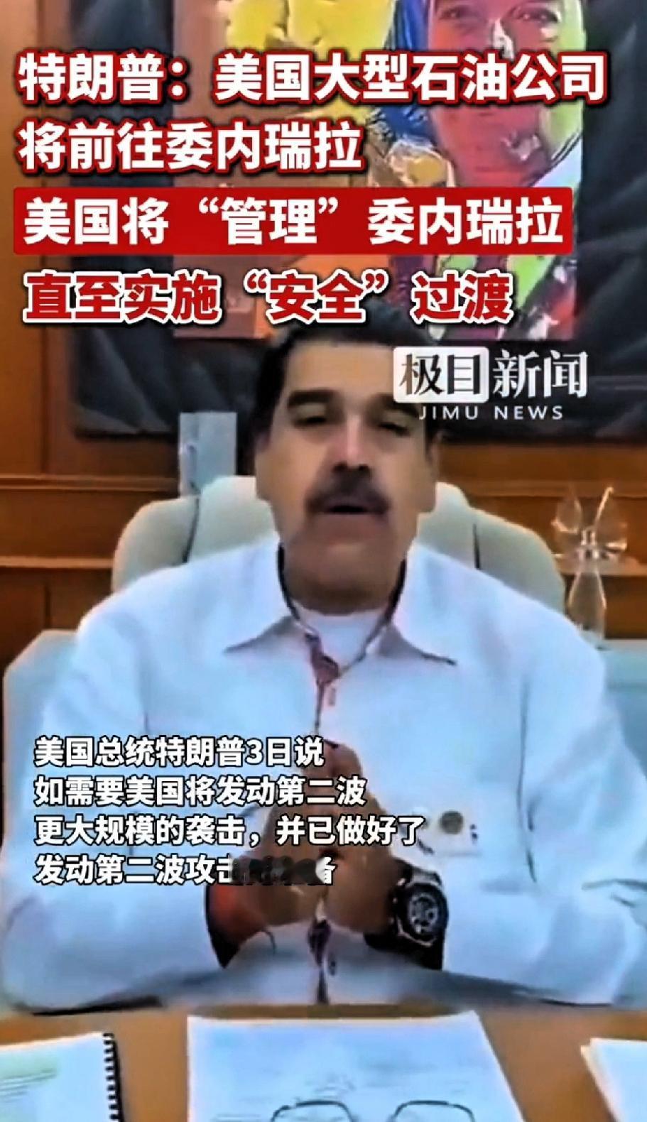 特朗普:美国大型石油公司将前往委内瑞拉,美国将“管理”委内瑞拉,直至实施“安全”过渡。 特朗普这波操作不出意外,先是找借口对石油国家进行军事打击,然后迫不及待抢夺石油。 当地时间1月3日新闻发布会上,他先说美军突袭委内瑞拉抓走马杜罗夫妇,还描述得有鼻子有眼,什么“陆海空”三军出动,150多架飞行器参与,行动持续2小时20分钟,甚至还发了马杜罗戴手铐的照片。 委内瑞拉如此不堪一击,怕是内鬼太多,两军还没交手,委方老大就被俘获了。可以说美军这次赢得太容易了。之前委内瑞拉还大张旗鼓的动员全民参军,还以为两国会有个来回,谁知道开始即是结束,难怪美军如此嚣张。 又说要让美国大型石油公司“进入”委内瑞拉,还称美国要“管理”委内瑞拉直到“安全过渡”。石油滋生美军,没有你们人家才安全。什么打击毒贩?就是明目张胆的抢夺石油。丑恶的嘴脸显露无遗。 更离谱的是还放话如有必要会发动“第二波”攻击。这哪是正常外交,分明是赤裸裸的霸权行径,为了石油利益不择手段,把委内瑞拉当成自家后花园随意践踏。 是否进行第二轮攻击,那要看委内瑞拉是否反抗,石油接管是否顺利,这才是主要目的。 全世界都知道,美国还要强硬的找一些可笑的借口。