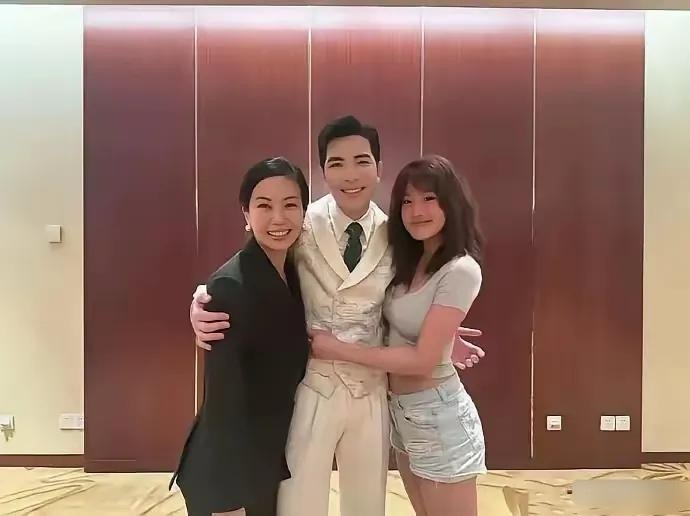 贾静雯的大女儿梧桐妹,跟萧敬腾夫妇合影。梧桐妹穿着暴露,紧贴着萧敬腾,一只手还抱着腰。萧敬腾一只手抱着自己的老婆,另外一只手保持距离,礼貌性的放梧桐妹的腰后面。