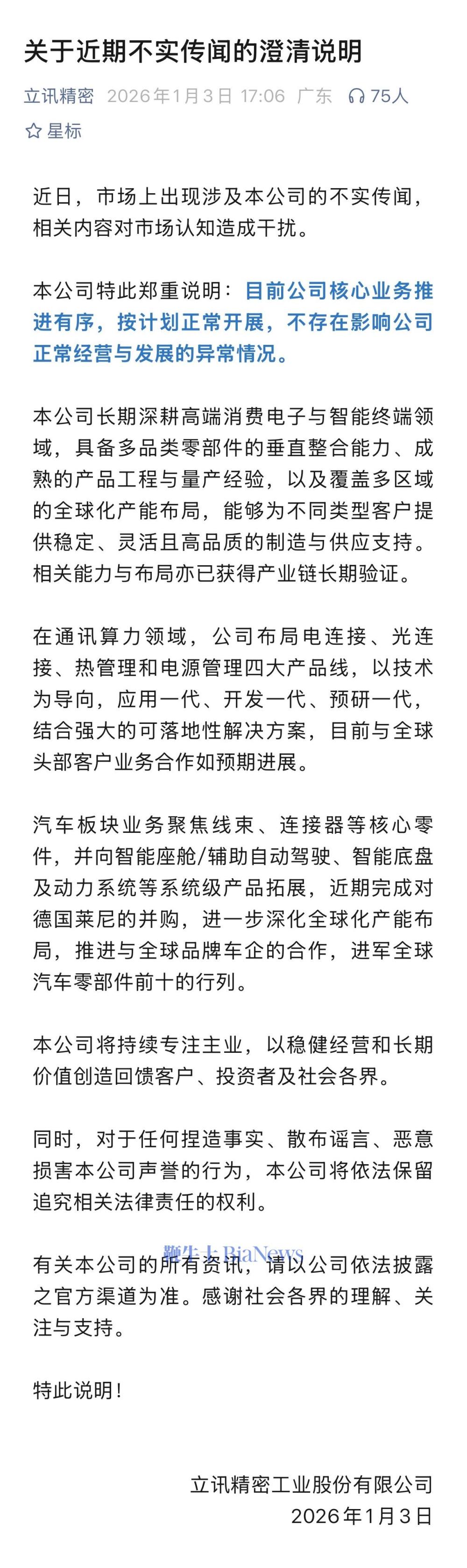 1月4日消息,昨日立讯精密发文称,近日,市场上出现涉及本公司的不实传闻,相关内容对市场认知造成干扰。