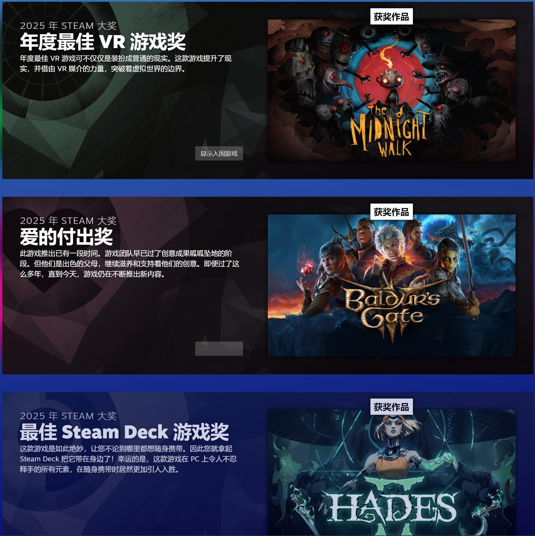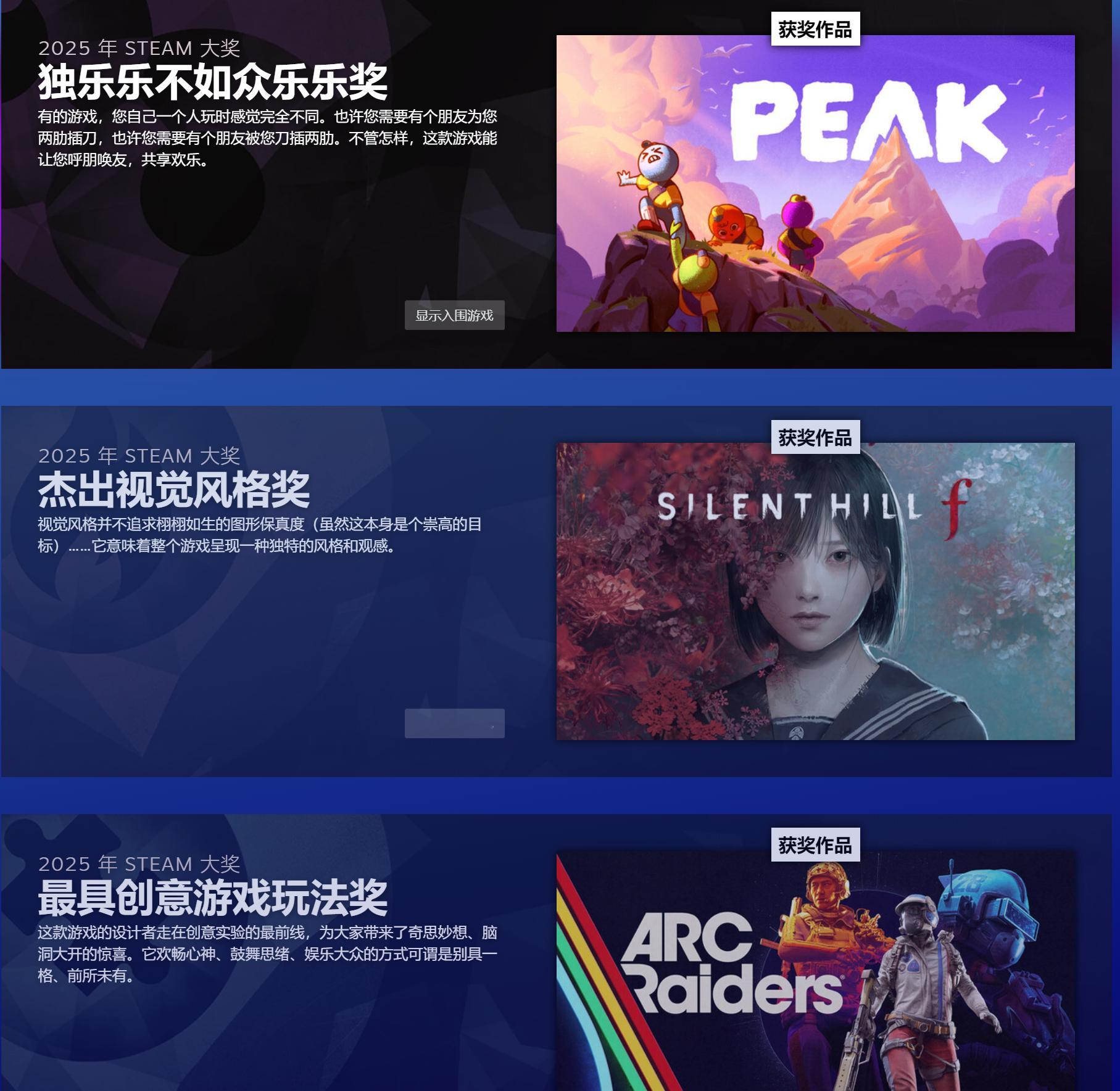 【《空洞骑士:丝之歌》年度最佳!Steam大奖名单揭晓】V社公布了2025 Steam大奖的获奖名单,奖项由公众投票决定,Steam年度最佳游戏奖给予了《空洞骑士:丝之歌》。今年的Steam大奖包括11个奖项,分别为:轻松惬意奖、杰出剧情游戏奖、最佳原声音轨奖、纵使手残仍大爱奖、最具创意游戏玩法奖、杰出视觉风格奖、独乐乐不如众乐乐奖、最佳 Steam Deck 游戏奖、爱的付出奖、年度最佳VR游戏和年度最佳游戏奖。以下是各个奖项名单:年度最佳游戏奖:《空洞骑士:丝之歌》年度最佳 VR 游戏奖:《午夜漫步》爱的付出奖:《博德之门3》最佳 Steam Deck 游戏奖:《哈迪斯2》独乐乐不如众乐乐奖:《PEAK》杰出视觉风格奖:《寂静岭f》最具创意游戏玩法奖:《Arc Raiders》纵使手残仍大爱奖:《空洞骑士:丝之歌》最佳原声音轨奖:《光与影:33号远征队》杰出剧情游戏奖:《超英派遣中心》轻松惬意奖:《我们到了吗?》
