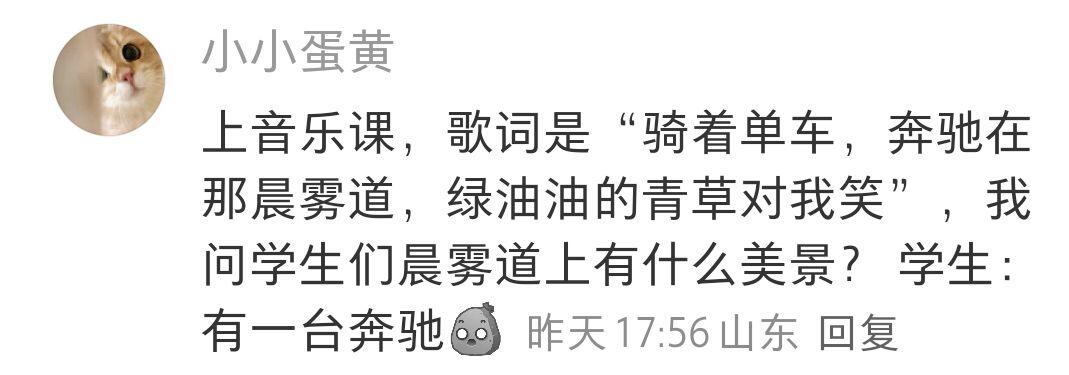 上音乐课,歌词是"骑着单车,奔驰在那晨雾道,绿油油的青草对我笑",我问学生们晨雾道上有什么美景? 学生:有一台奔驰