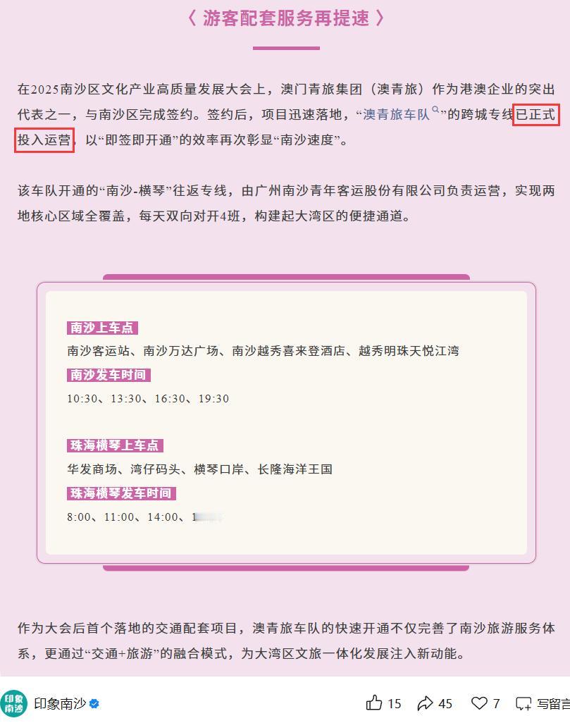 【南沙⇌珠海快线新增停靠站点】南沙蕉门公交总站至珠海拱北口岸线路从2026年1月1日起在南沙区内增设停靠站。不过这次的站点有点莫名其妙,因为新增的是庙贝农场站。 虽然说从蕉门站出发,然后就上进港大道,一直过亭角,到灵山立交,中间都不好设站,但是在庙贝农场站这里设站都不如不设了。毕竟周边都没有任何楼盘和公司,唯一方便的估计就是灵山岛那边开车打车过来的人了。设站都还不如不设站。 南沙⇌珠海快线其实说真的还是挺方便的,39.9元,一个小时左右就可以从南沙去到珠海,但是有时候会从大巴变成中巴,有点开盲盒的意思,这点体验感就差了点。 看之前官方新闻表示南沙和澳门青旅集团(澳青旅)签约。签约后,项目迅速落地,“澳青旅车队”的跨城专线已正式投入运营。这条南沙区珠海的快线,可以去到横琴口岸、长隆海洋王国等。不过小编真的是找了各种资料,都找不到任何的订票入口,连联系方法都找不到。不知道应该是怎么订票了。 其实目前南沙区珠海还有很多各种巴士可以去到,比如“样样巴士”、“小满巴士”等,大家可以在微信上搜一下,部分车次在蕉门可以上下车。