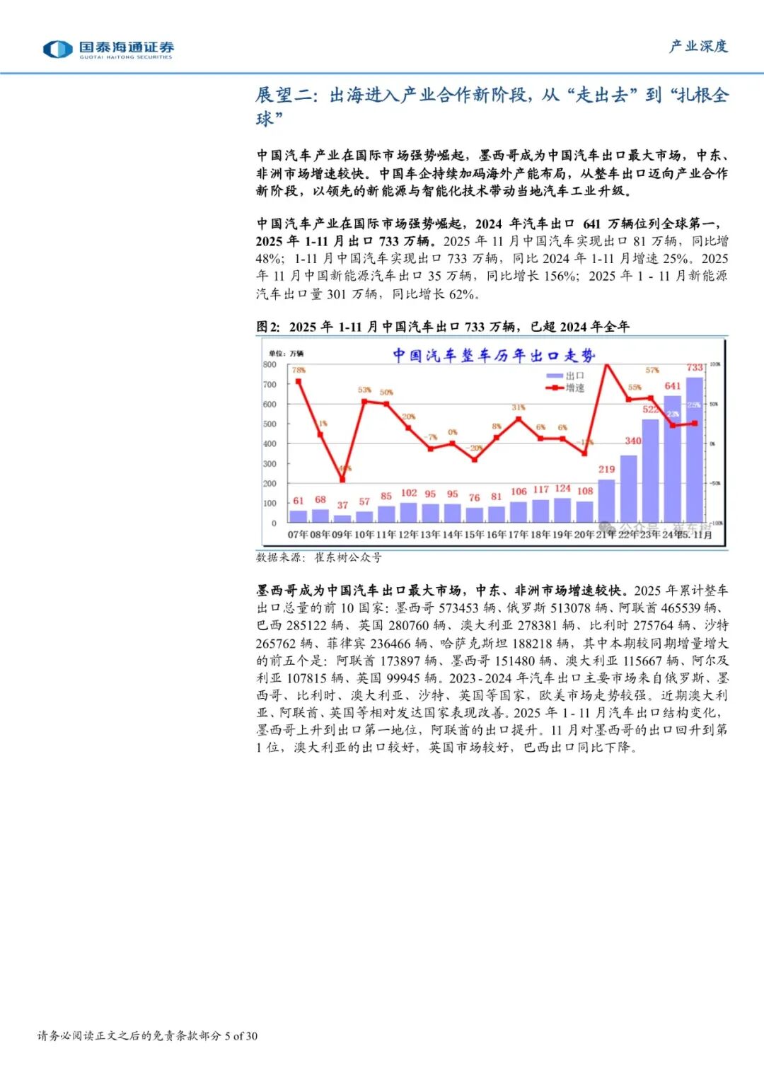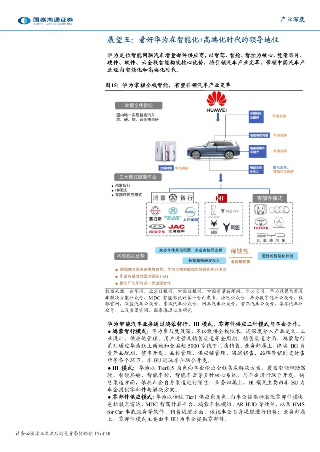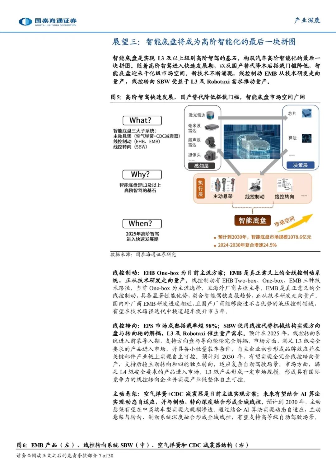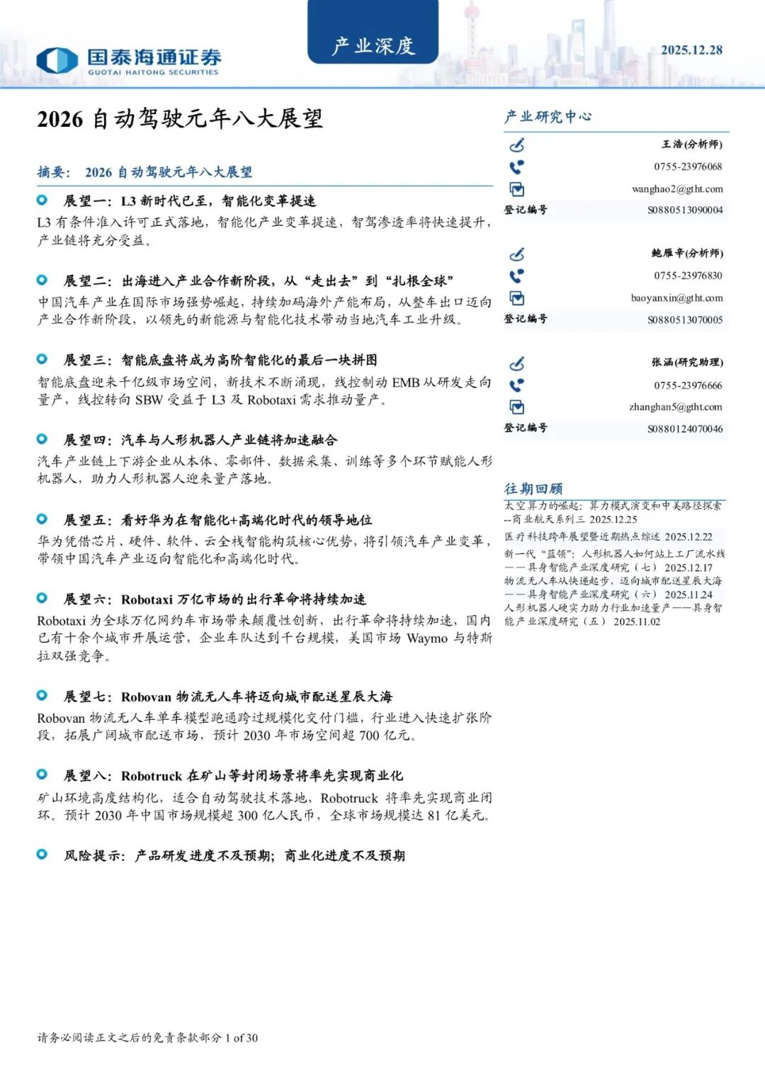 展望一:L3新时代已至,智能化变革提速;展望二:出海进入产业合作新阶段,从“走出去”到“扎根全球”;展望三:智能底盘将成为高阶智能化的最后一块拼图;展望四:汽车与人形机器人产业链将加速融合;展望五:看好华为在智能化+高端化时代的领导地位;展望六:Robotaxi万亿市场的出行革命将持续加速;展望七:Robovan物流无人车将迈向城市配送星辰大海;展望八:Robotruck在矿山等封闭场景将率先实现商业化。