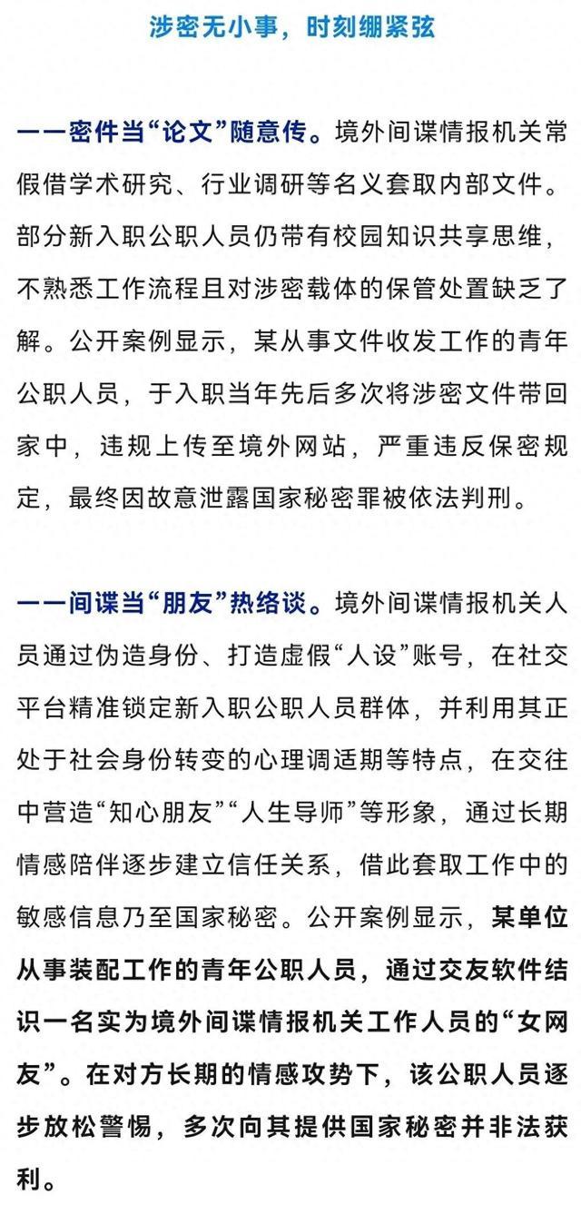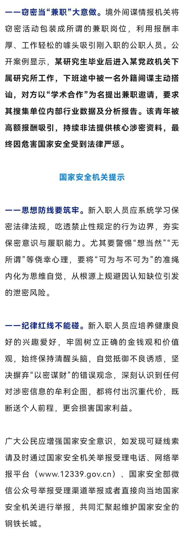 通过个人努力顺利考公“上岸”,是人生的崭新开始。然而,由于社会经验相对不足、身份转变尚在适应期,个别人员的保密意识尚未完全筑牢,初入职场的公职人员易被境外间谍情报机关视为目标对象,以各种卑劣手段拉拢策反,危害我国家安全。