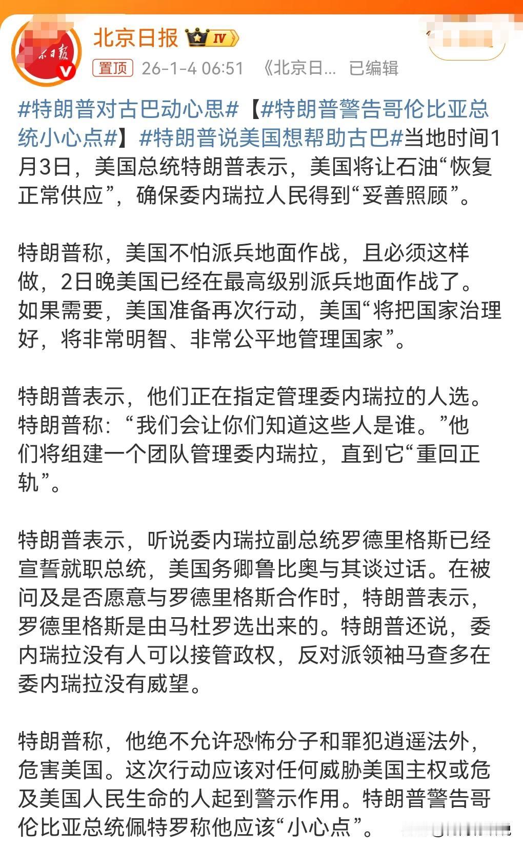 坚决反对帝国主义。特朗普政府太不地道了,竟然跑到委内瑞拉,把委内瑞拉的总统给绑架了。 真是太丧心病狂了,无视全球的法律,特朗普政府应该受到制裁。 当地时间1月3日,特朗普警告哥伦比亚总统小心点。 这是赤裸裸的威胁,实在是太恶劣了。 而且他还对古巴有了想法。 太厚颜无耻了。 希望特朗普早点下台,绝对不能让这样邪恶的人当美国总统。