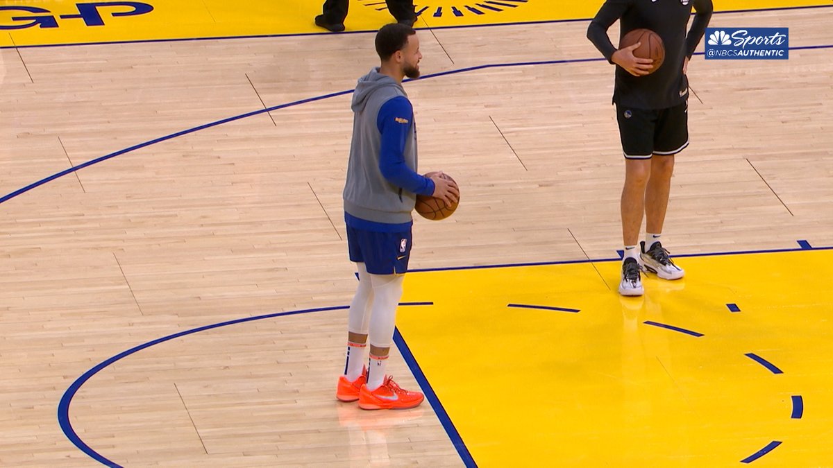NBC勇士账号报道,斯蒂芬·库里在赛前热身时穿着"TotalOrange"配色的耐克科比6代战靴